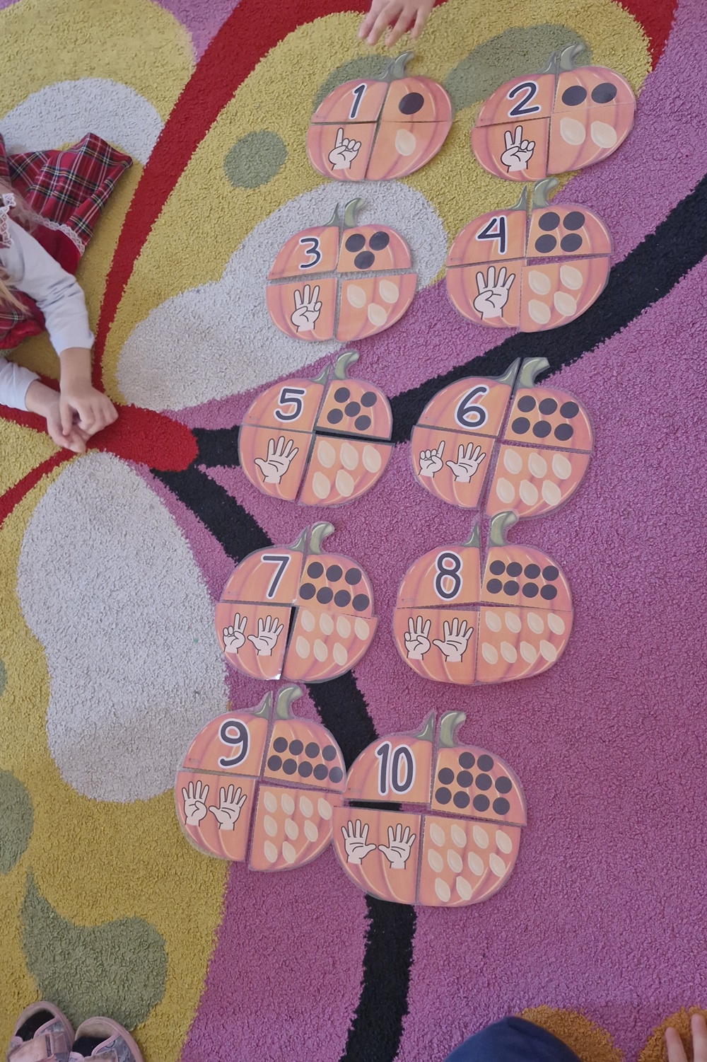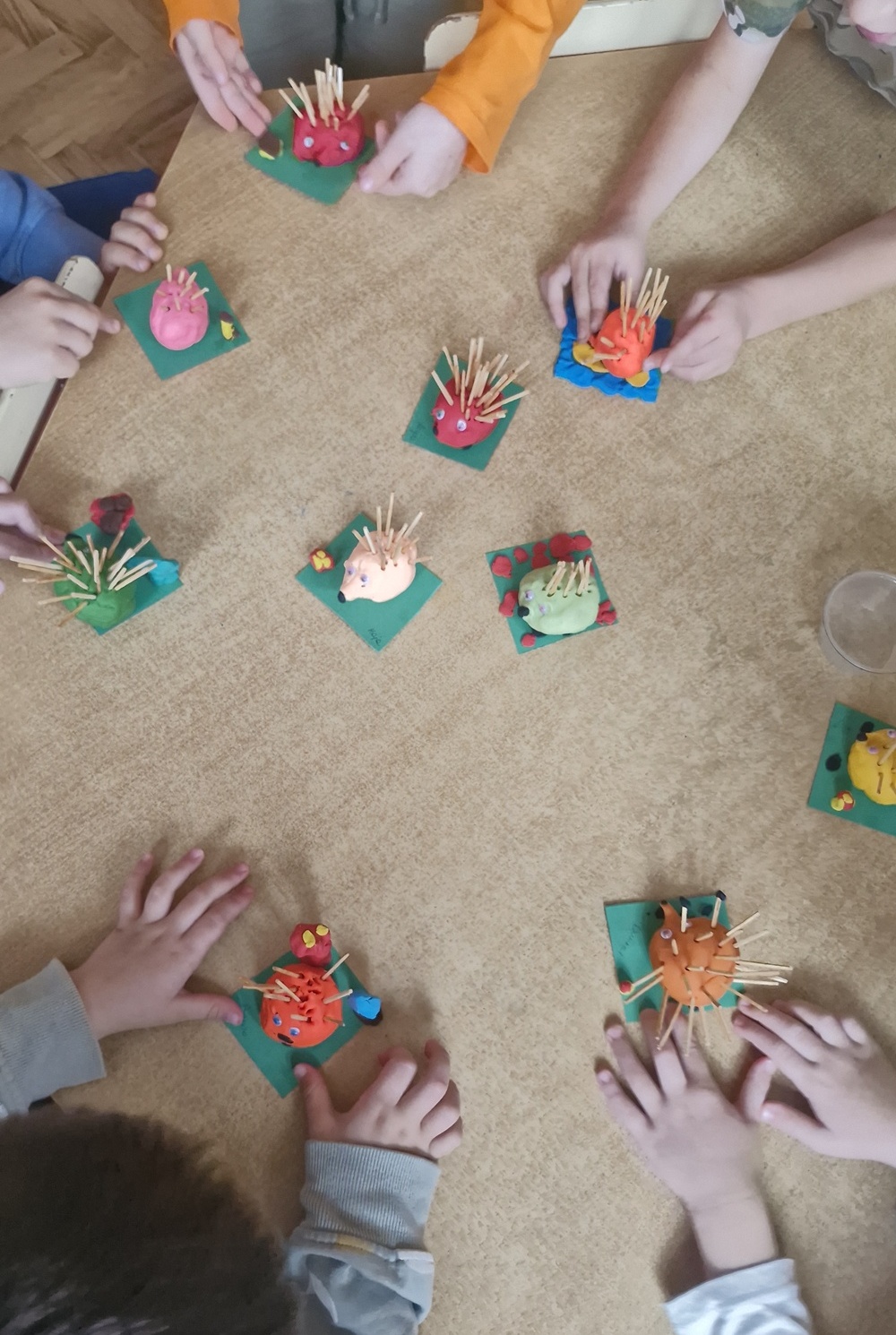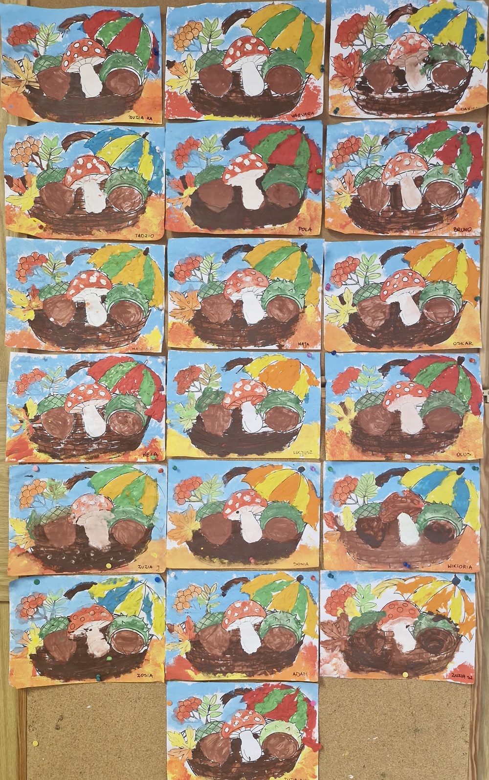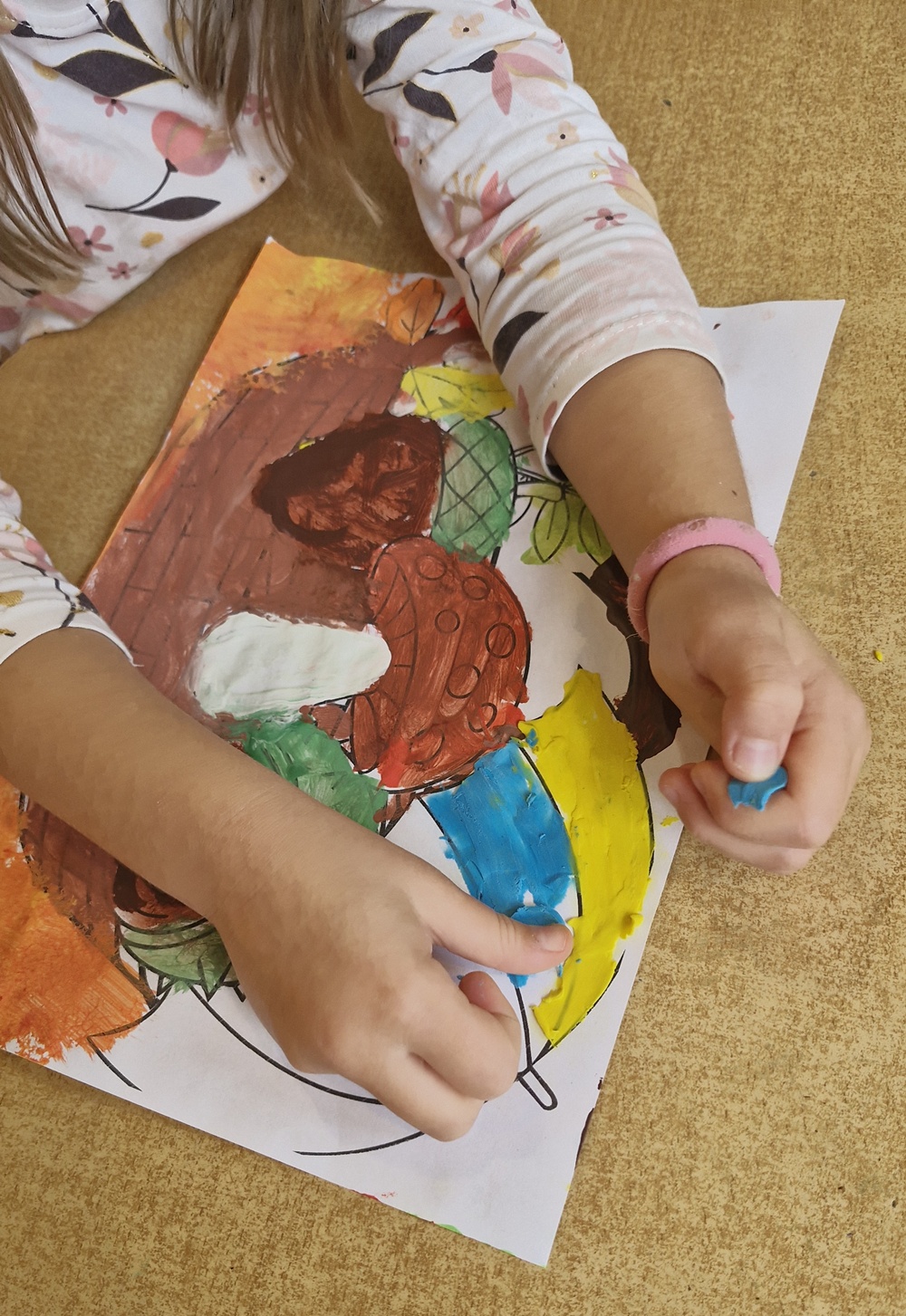 Ostatni tydzień października w grupie fioletowej to czas związany tematycznie z jesienią. Przedszkolaki przypomniały, jakie dary niesie za sobą ta pora roku i wykonały pracę plastyczną - kosz z darami jesieni. Dzieci ćwiczyły motorykę małą nie tylko poprzez korzystanie z pędzla podczas malowania farbami, ale również wyklejając z plasteliny parasol i lepiąc z masy plastycznej jeżyki. W tym tygodniu wykorzystaliśmy kasztany, które dzieci przyniosły do przedszkola, aby odtworzyć z nich wzory przedstawione na ilustracjach. Nie zabrakło również zabaw matematycznych - ćwiczyliśmy przeliczanie oraz utrwalaliśmy sobie zapis graficzny cyfr 0-9 i liczby 10, układając dynie pocięte na cztery równe części w całość.