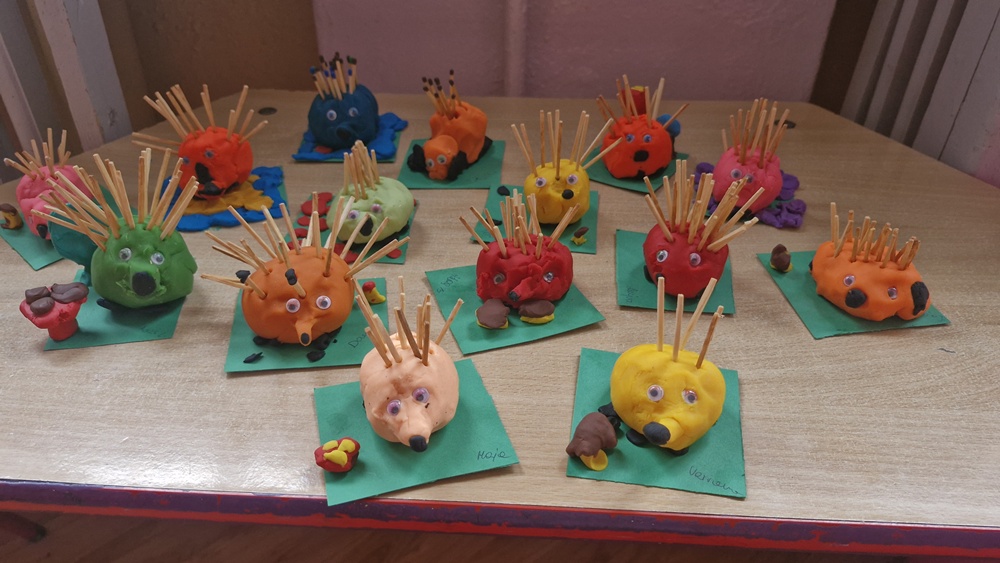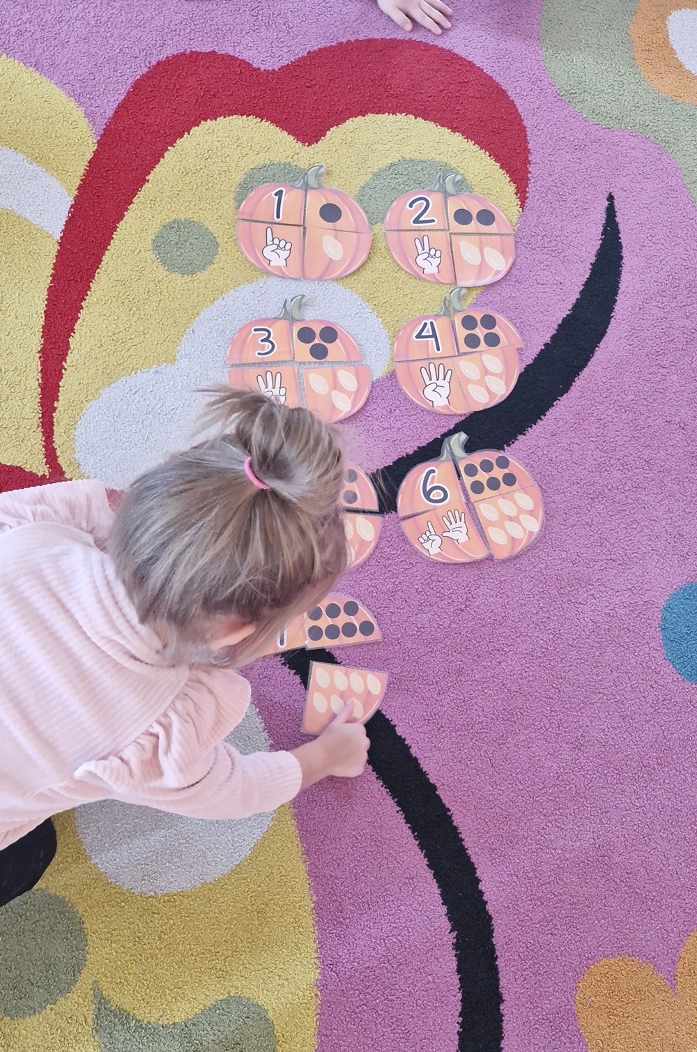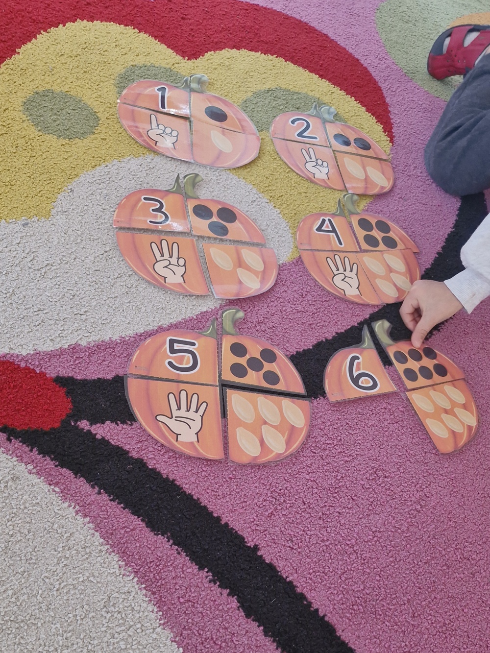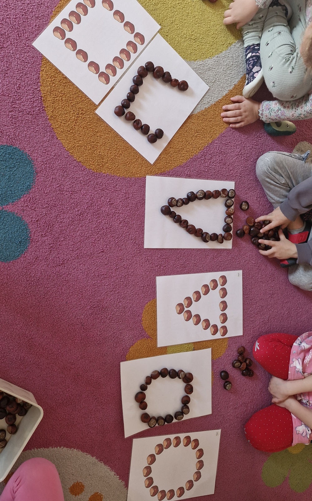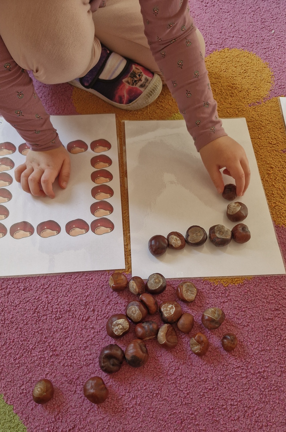 Ostatni tydzień października w grupie fioletowej to czas związany tematycznie z jesienią. Przedszkolaki przypomniały, jakie dary niesie za sobą ta pora roku i wykonały pracę plastyczną - kosz z darami jesieni. Dzieci ćwiczyły motorykę małą nie tylko poprzez korzystanie z pędzla podczas malowania farbami, ale również wyklejając z plasteliny parasol i lepiąc z masy plastycznej jeżyki. W tym tygodniu wykorzystaliśmy kasztany, które dzieci przyniosły do przedszkola, aby odtworzyć z nich wzory przedstawione na ilustracjach. Nie zabrakło również zabaw matematycznych - ćwiczyliśmy przeliczanie oraz utrwalaliśmy sobie zapis graficzny cyfr 0-9 i liczby 10, układając dynie pocięte na cztery równe części w całość.