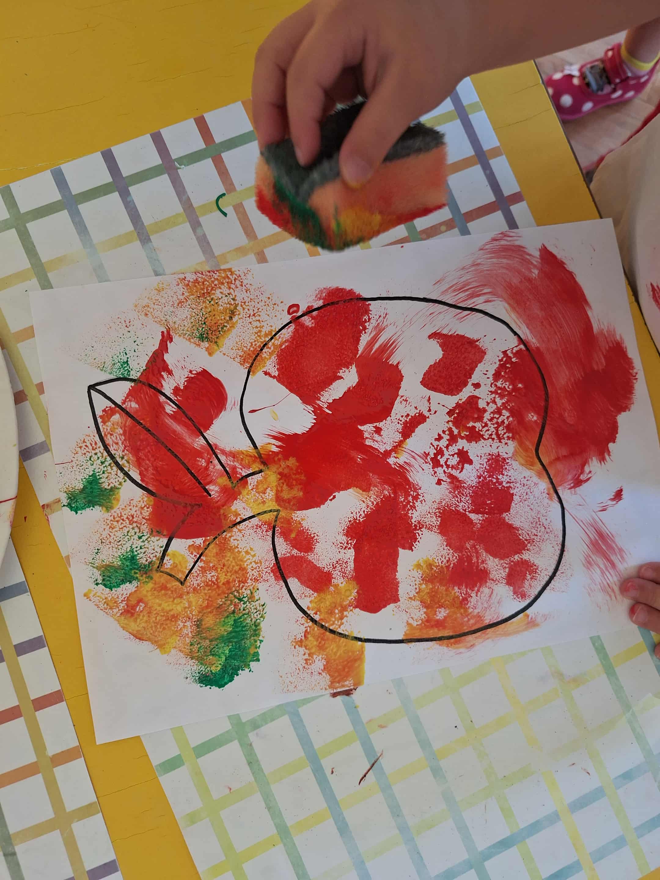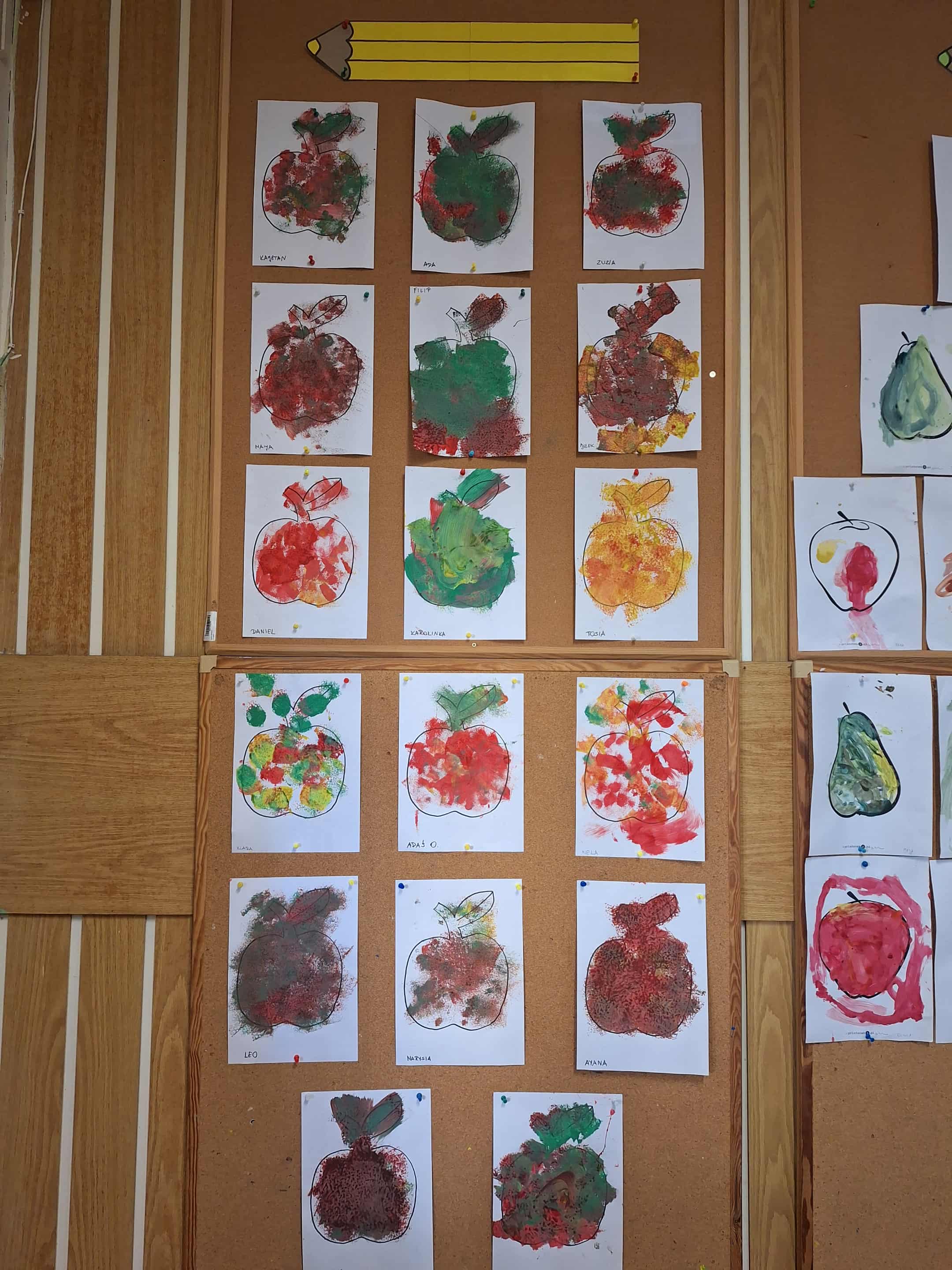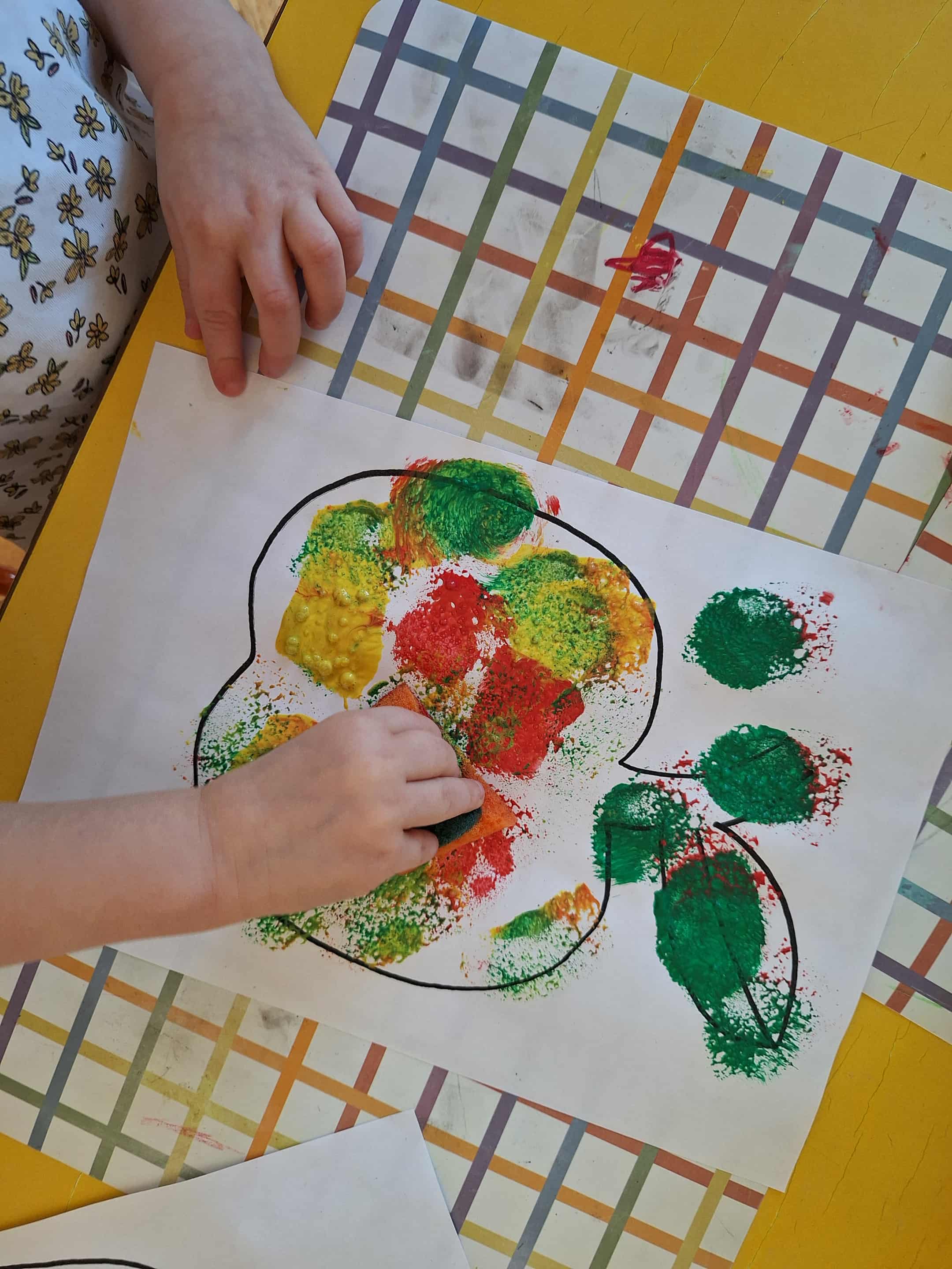 We wrześniu w grupie żółtej nasze zabawy i działania artystyczne zdominowały warzywa i owoce. Dzieci chętnie uczestniczyły w zabawach w kole. Przypomnieliśmy sobie wspólnie nazwy owoców i warzyw. Później dzieci miały za zadanie po dotyku rozpoznać jakie to warzywo lub owoc. Przedszkolaki wykonały prace plastyczną ,,Jabłuszko", malowały farbami za pomocą gąbek. Uczestniczyliśmy także w przygotowaniach do przedszkolnego Pikniku. Nasza grupa zajęła się przygotowaniem ogórków małosolnych w słoikach. Dzieci były bardzo zaangażowane w te działania i chętnie przyrządzały przetwory.