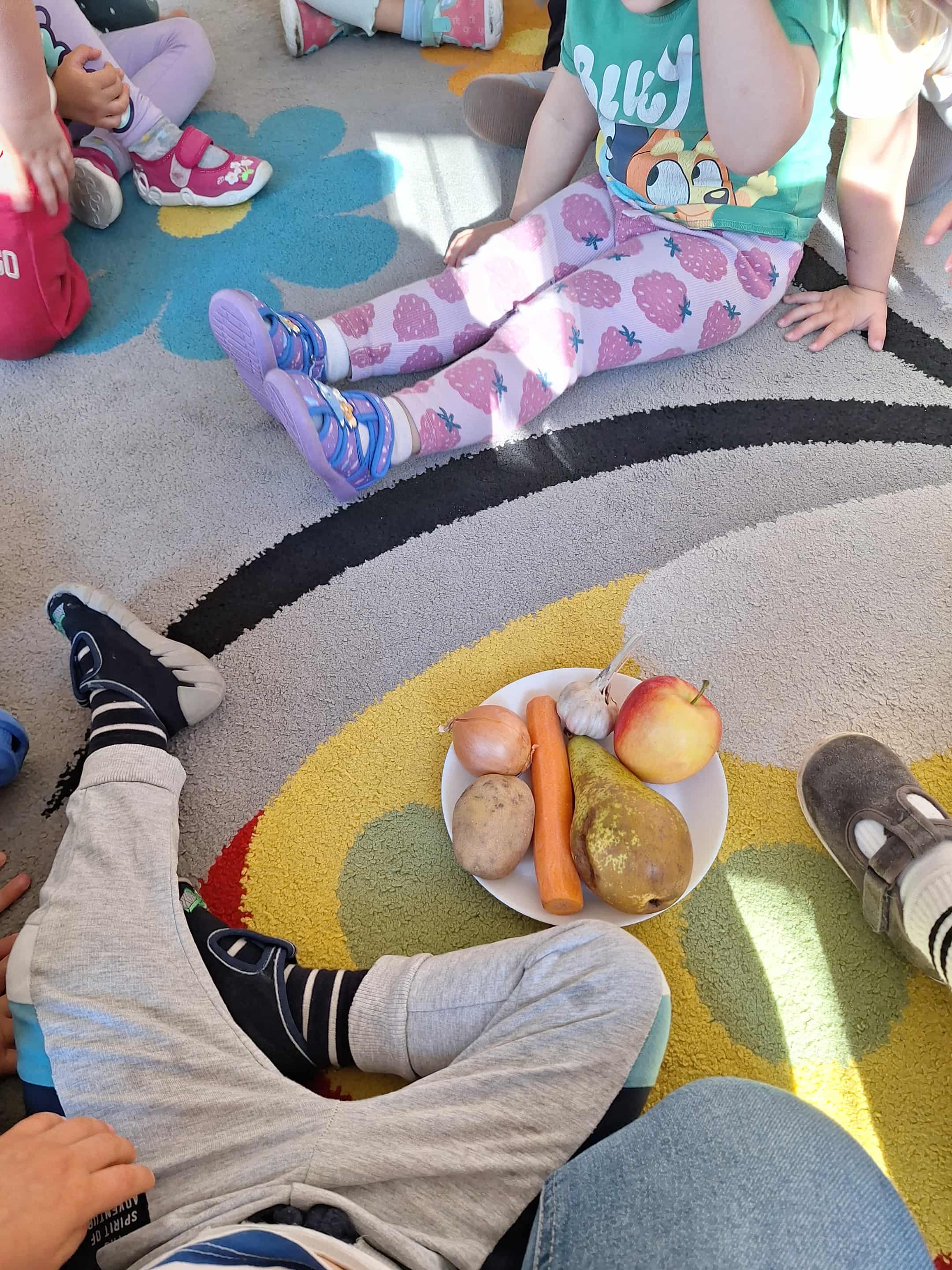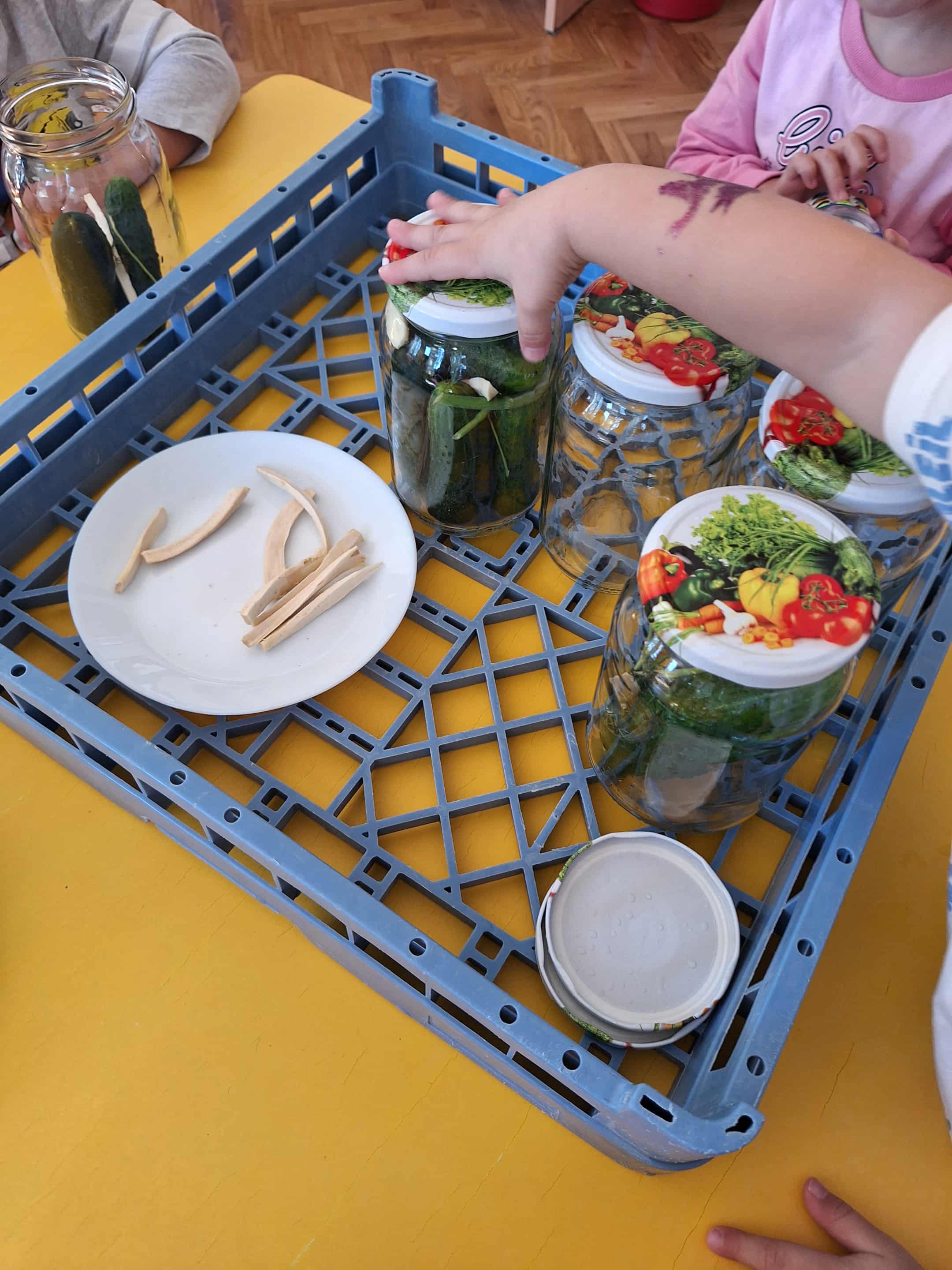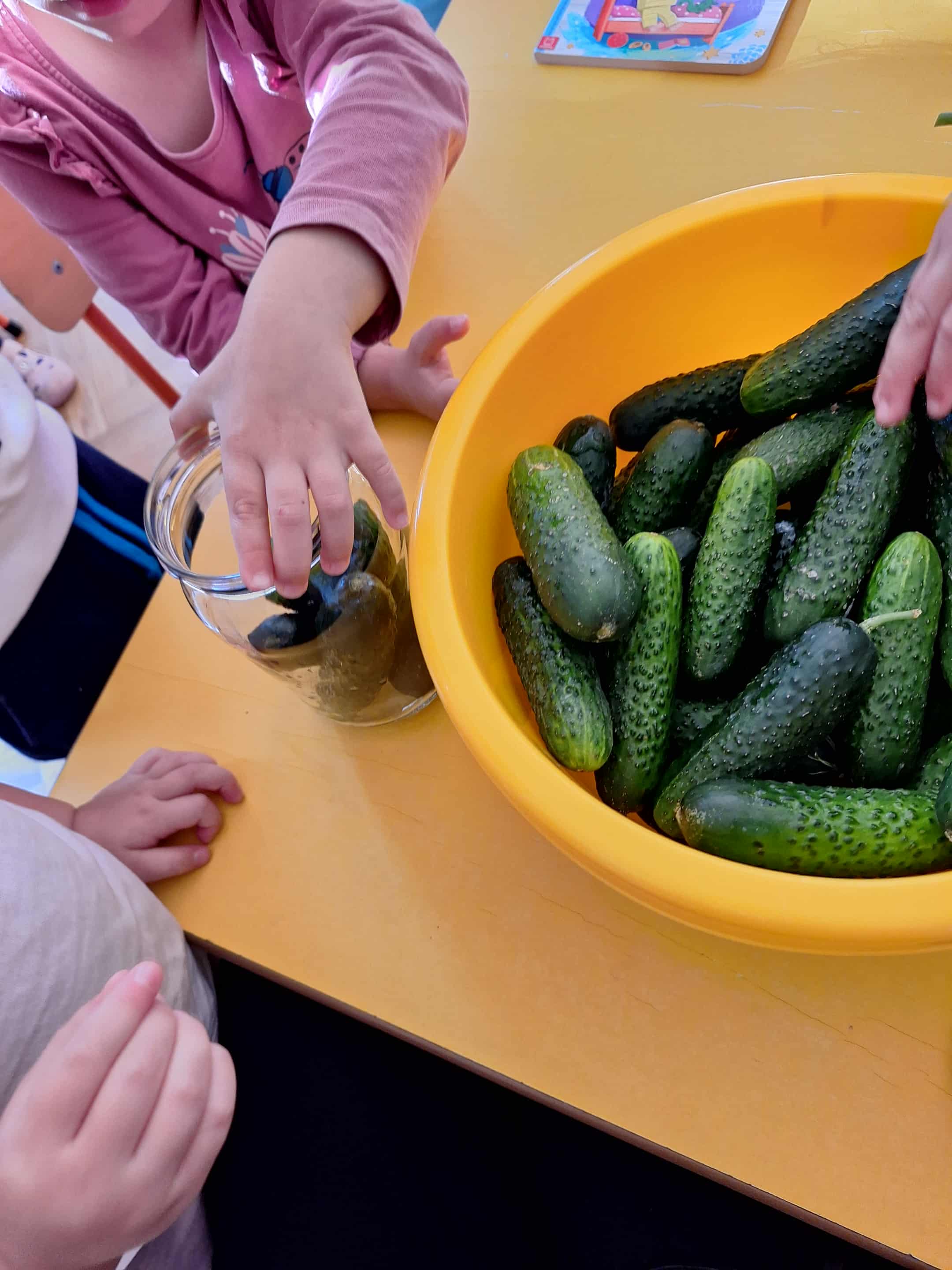 We wrześniu w grupie żółtej nasze zabawy i działania artystyczne zdominowały warzywa i owoce. Dzieci chętnie uczestniczyły w zabawach w kole. Przypomnieliśmy sobie wspólnie nazwy owoców i warzyw. Później dzieci miały za zadanie po dotyku rozpoznać jakie to warzywo lub owoc. Przedszkolaki wykonały prace plastyczną ,,Jabłuszko", malowały farbami za pomocą gąbek. Uczestniczyliśmy także w przygotowaniach do przedszkolnego Pikniku. Nasza grupa zajęła się przygotowaniem ogórków małosolnych w słoikach. Dzieci były bardzo zaangażowane w te działania i chętnie przyrządzały przetwory.