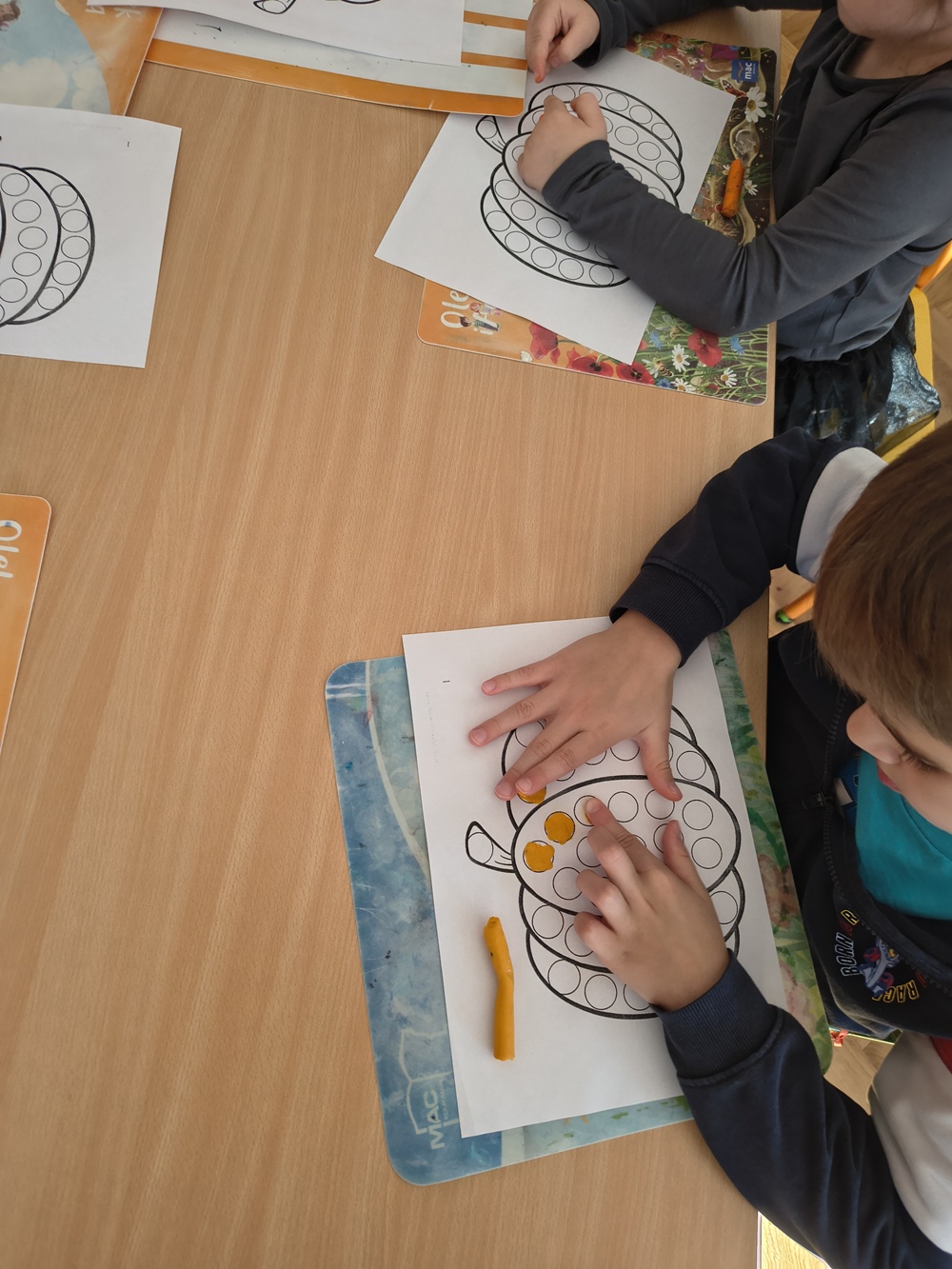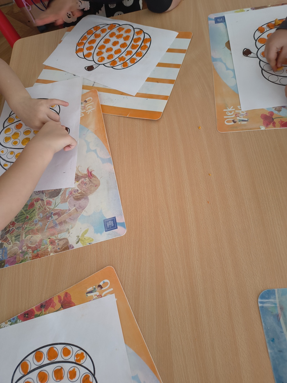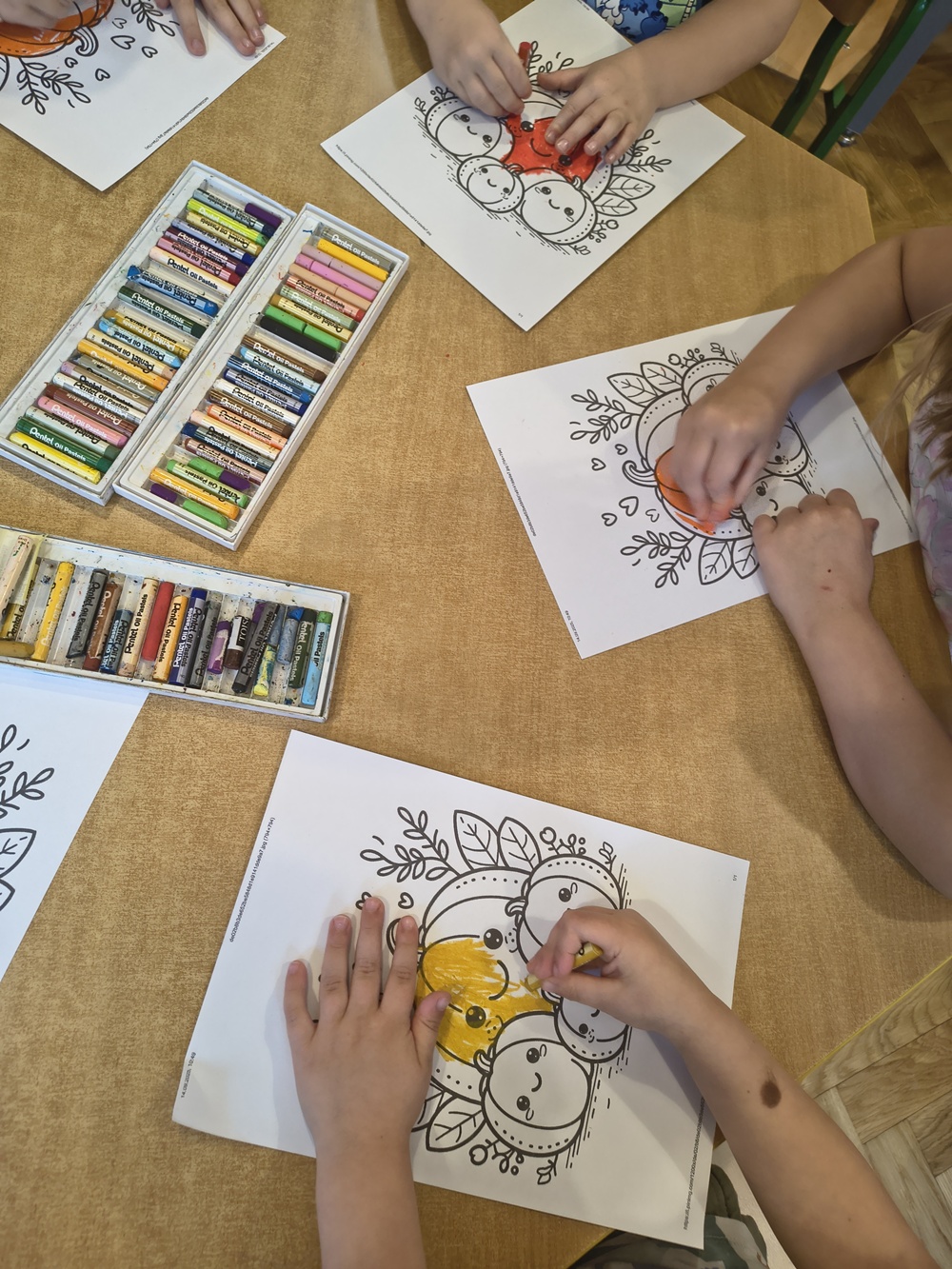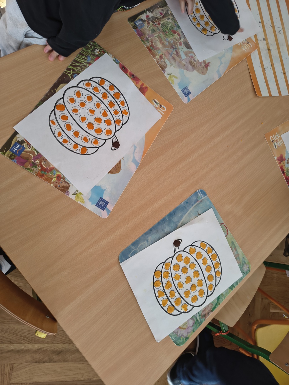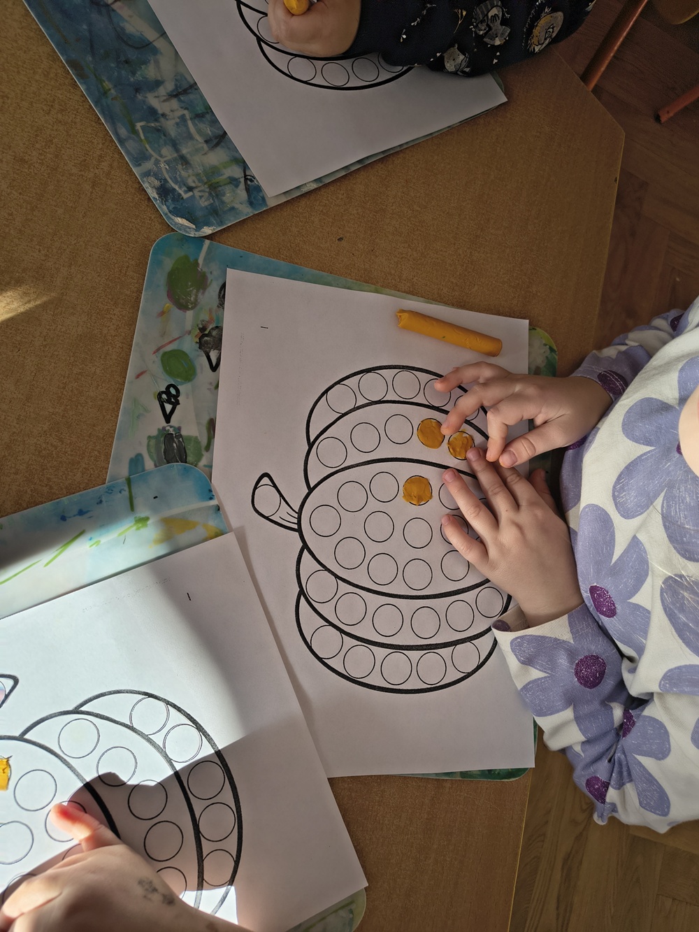 Dziś u nas w grupie swoje święto miała dynia. Najpierw rozmawialiśmy, jak wygląda, co można z niej zrobić np. latarenki, jesienne dekoracje oraz jakie potrawy się przyrządza z dyni. Poznaliśmy różne gatunki dyń, oglądaliśmy, dotykaliśmy oraz się nimi bawiliśmy. Robiliśmy prace plastyczne - dzieci wyklejały kropeczkami z plasteliny dynie oraz kolorowali pastelami rodzinkę dyniową.