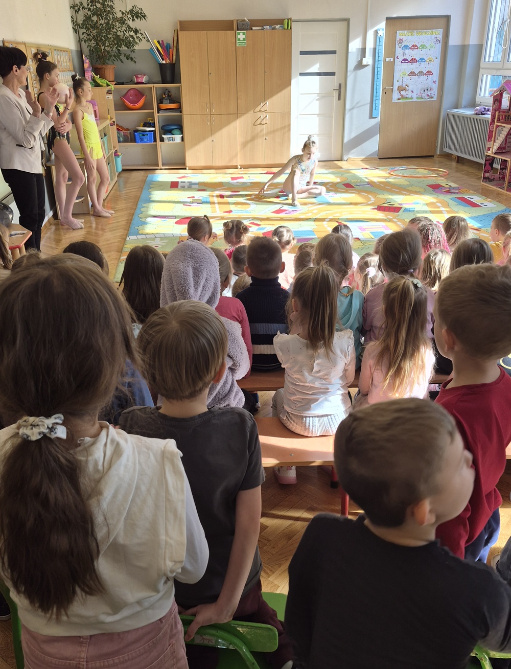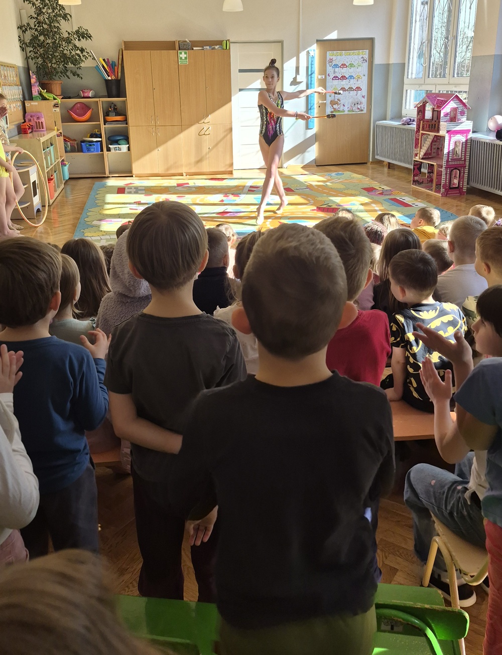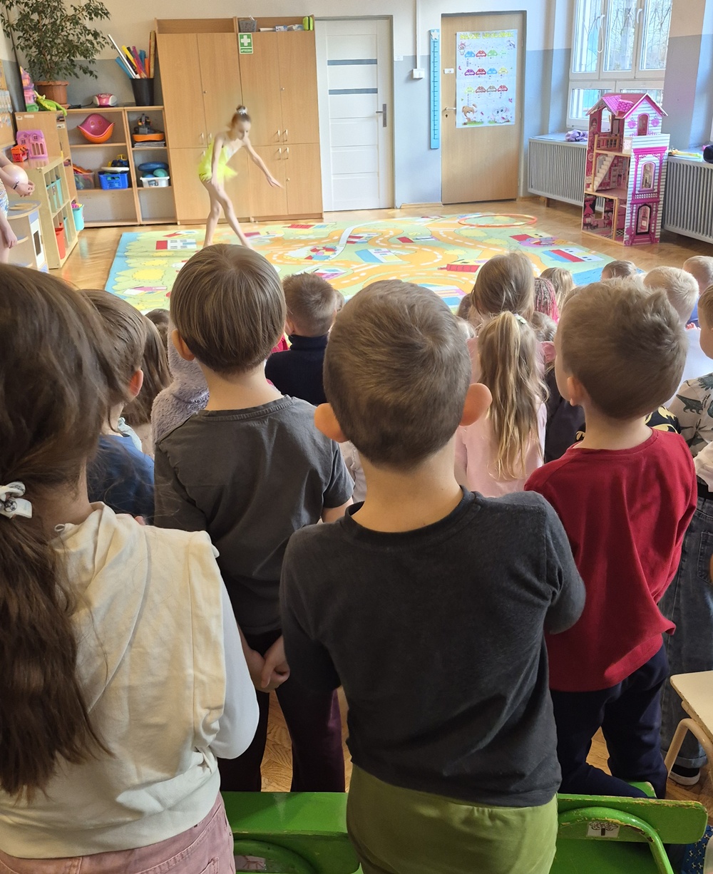 W dniu dzisiejszym nasze przedszkole odwiedziły uczennice ze Szkoły Podstawowej nr 41, które z ogromnym zaangażowaniem zaprezentowały nam swoje umiejętności w zakresie gimnastyki artystycznej. Dziewczynki przedstawiły kilka układów taneczno-gimnastycznych z wykorzystaniem maczug, obręczy, wstążek. Występ był pełen gracji, lekkości i kolorów, a każdy element choreografii został starannie przygotowany. Przedszkolaki ze wszystkich grup oglądały pokaz z wielkim zainteresowaniem i podziwem. Nie zabrakło gromkich braw oraz uśmiechów na twarzach naszych małych widzów. Serdecznie dziękujemy dziewczynkom za odwiedziny oraz wspaniały występ.