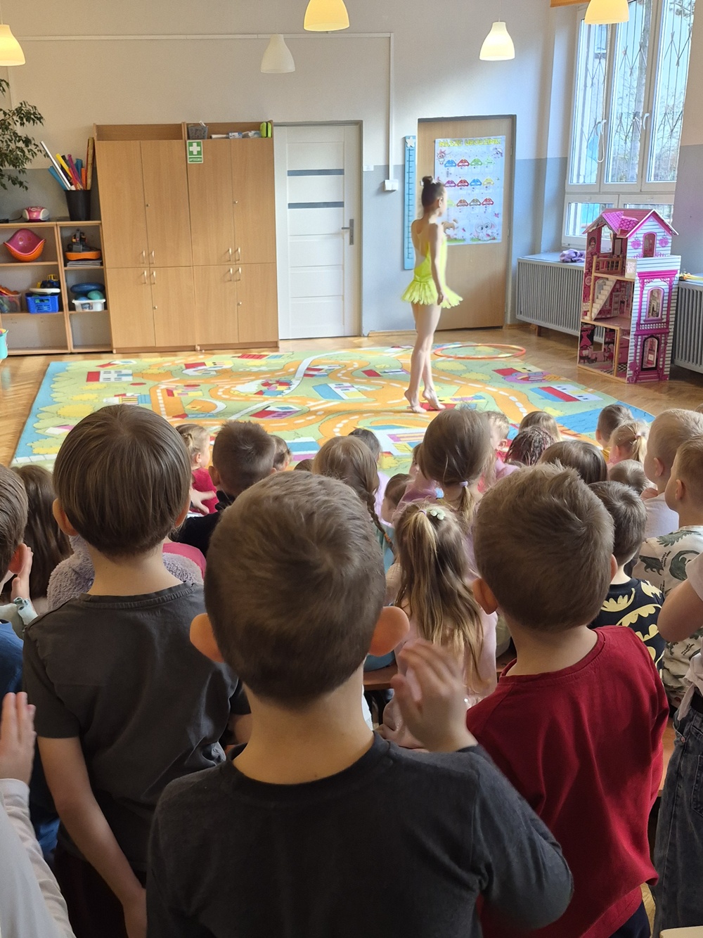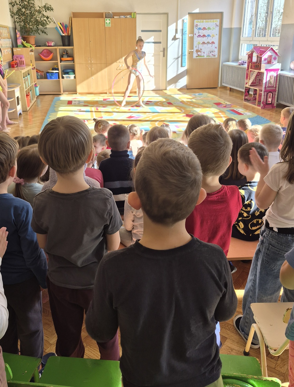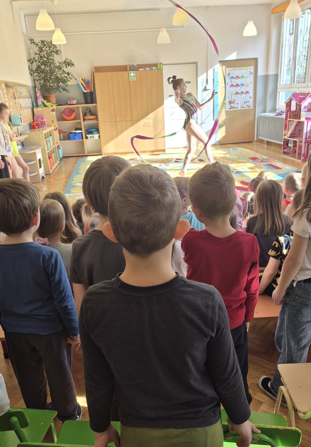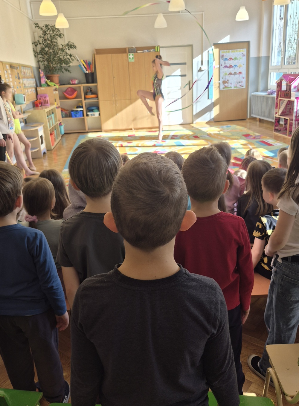 W dniu dzisiejszym nasze przedszkole odwiedziły uczennice ze Szkoły Podstawowej nr 41, które z ogromnym zaangażowaniem zaprezentowały nam swoje umiejętności w zakresie gimnastyki artystycznej. Dziewczynki przedstawiły kilka układów taneczno-gimnastycznych z wykorzystaniem maczug, obręczy, wstążek. Występ był pełen gracji, lekkości i kolorów, a każdy element choreografii został starannie przygotowany. Przedszkolaki ze wszystkich grup oglądały pokaz z wielkim zainteresowaniem i podziwem. Nie zabrakło gromkich braw oraz uśmiechów na twarzach naszych małych widzów. Serdecznie dziękujemy dziewczynkom za odwiedziny oraz wspaniały występ.