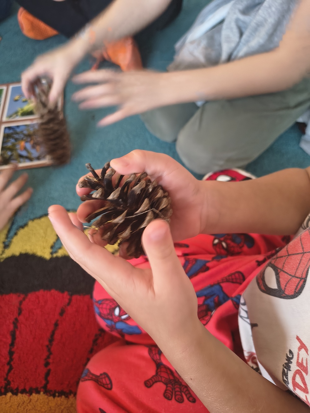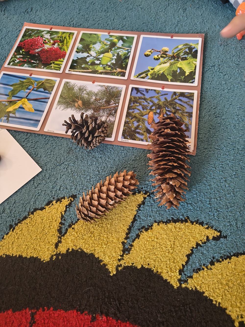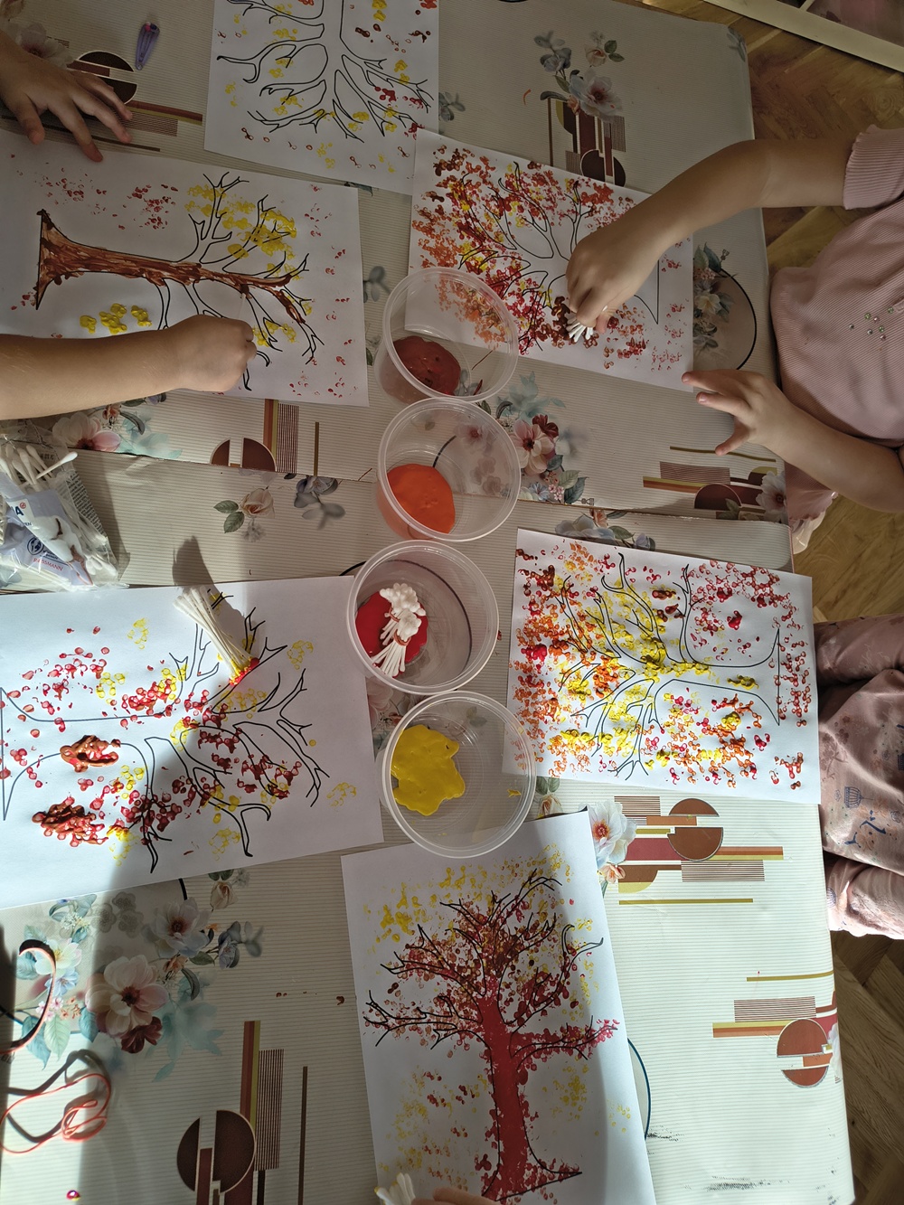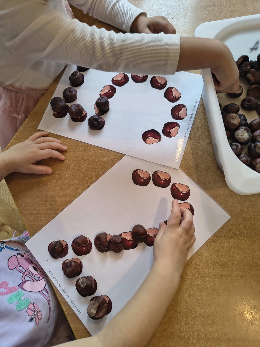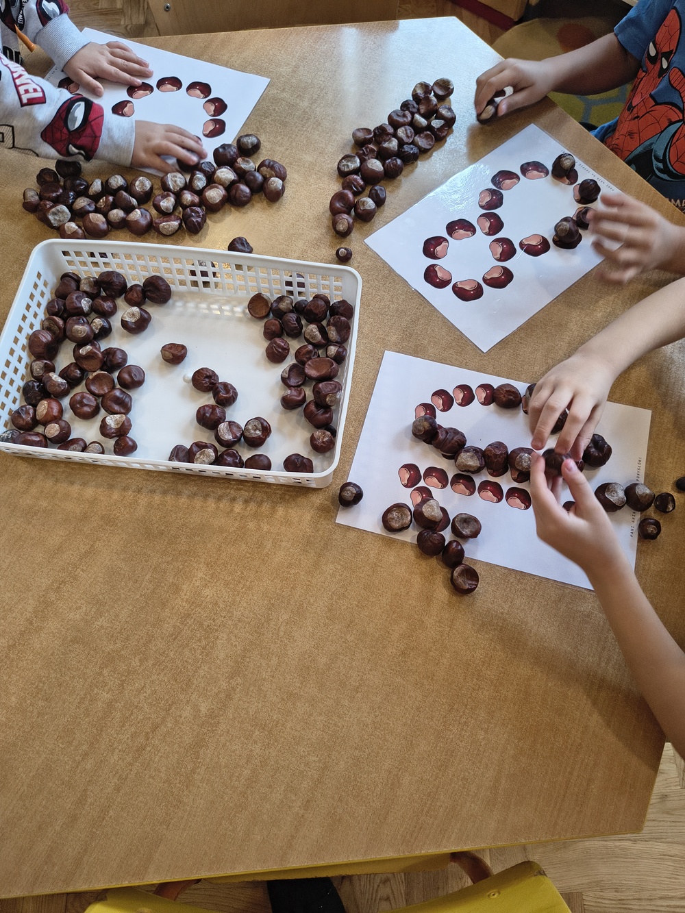 W tym tygodniu rozmawialiśmy o naszej pięknej złotej porze roku jaką jest jesień. Na początku tygodnia dzieci przynosiły dary jesieni, między innymi kasztany, żołędzie, orzechy, jarzębinę. Przypominaliśmy sobie jak wyglądają drzewa, owoce i liście poszczególnych drzew. Następnie segregowaliśmy dary jesieni: kasztany, żołędzie i orzechy. Było dużo zabaw matematycznych, przeliczaliśmy na konkretach, układaliśmy cyfry z kasztanów wg wzoru na kartkach. Nie mogło zabraknąć prac plastycznych - jedną z nich było drzewo jesienne malowane patyczkami kosmetycznymi moczonymi w farbach i stemplowanie kolorowych liści. Między zabawami śpiewaliśmy jesienne piosenki np.” Kolorowe listki “.