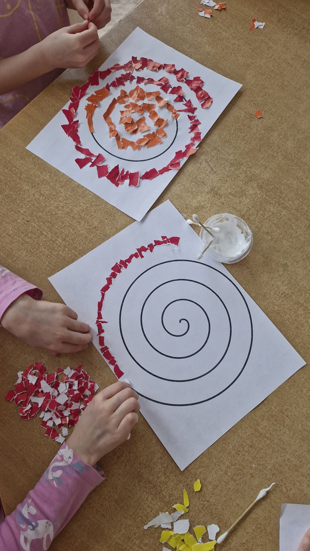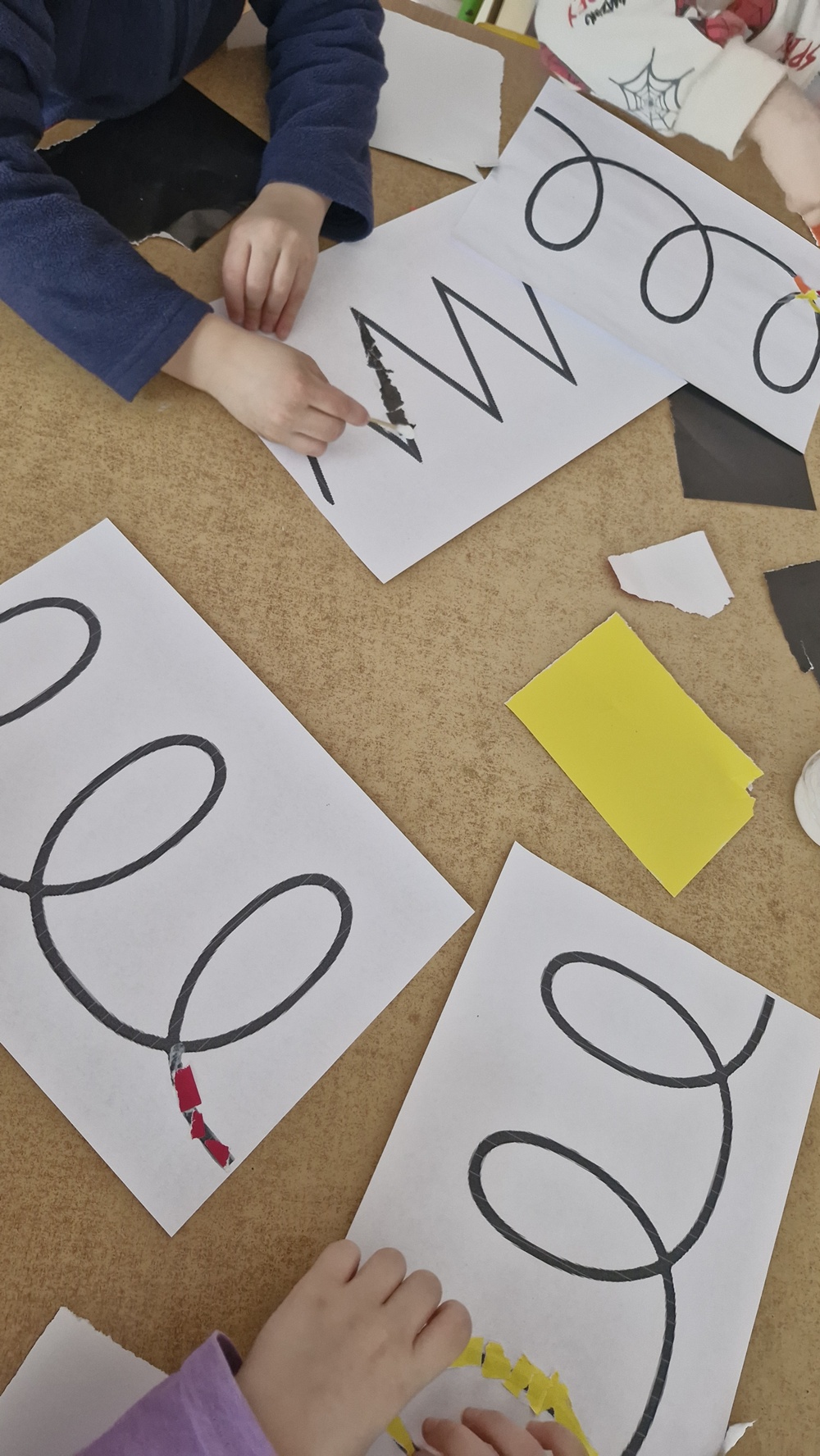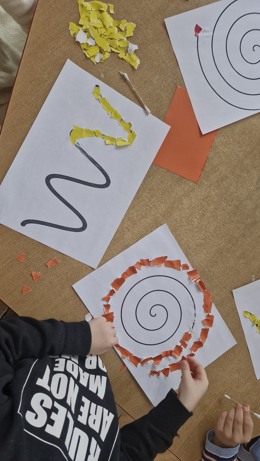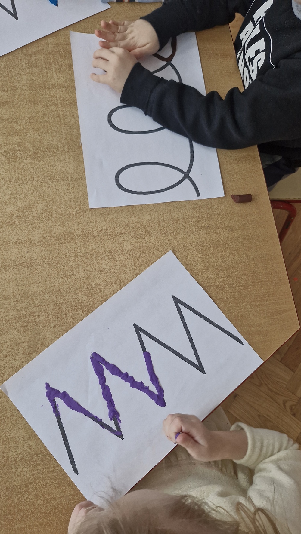 W ostatnich dniach przedszkolaki z grupy fioletowej zamieniły się w prawdziwych artystów. Podczas zajęć plastycznych dzieci wyklejały różne szlaczki i wzory plasteliną oraz kawałkami kolorowego papieru. Dzieci z ogromnym zaangażowaniem formowały z plasteliny wałeczki i paseczki, którymi starannie wypełniały przygotowane kontury. Kolorowy papier zamieniał się w barwne kompozycje - wydarte kawałki tworzyły niepowtarzalne wzory. Zajęcia nie tylko sprawiły dzieciom wiele radości, ale również wspierały rozwój motoryki małej, precyzji ruchów dłoni, koordynacji wzrokowo-ruchowej oraz koncentracji.