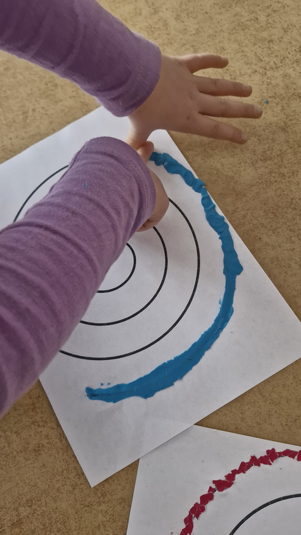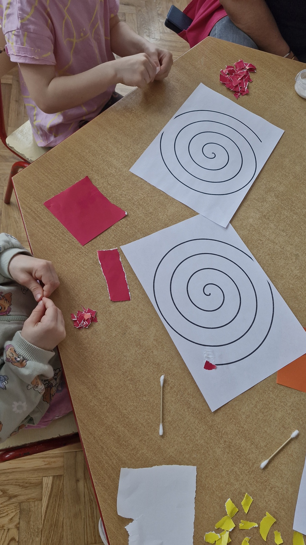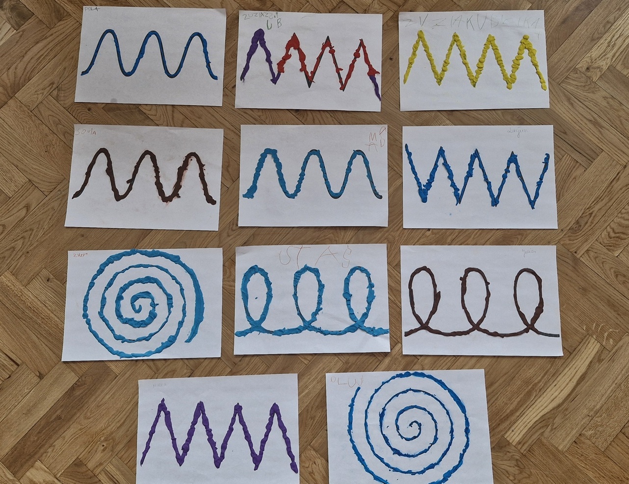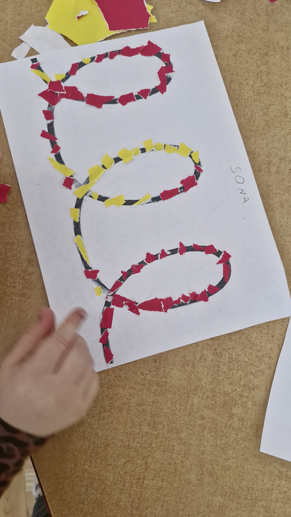 W ostatnich dniach przedszkolaki z grupy fioletowej zamieniły się w prawdziwych artystów. Podczas zajęć plastycznych dzieci wyklejały różne szlaczki i wzory plasteliną oraz kawałkami kolorowego papieru. Dzieci z ogromnym zaangażowaniem formowały z plasteliny wałeczki i paseczki, którymi starannie wypełniały przygotowane kontury. Kolorowy papier zamieniał się w barwne kompozycje - wydarte kawałki tworzyły niepowtarzalne wzory. Zajęcia nie tylko sprawiły dzieciom wiele radości, ale również wspierały rozwój motoryki małej, precyzji ruchów dłoni, koordynacji wzrokowo-ruchowej oraz koncentracji.