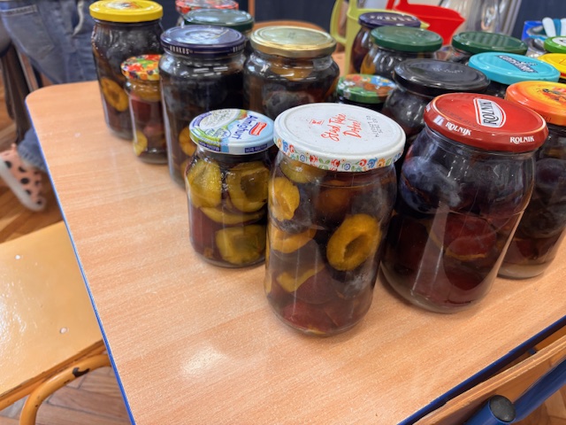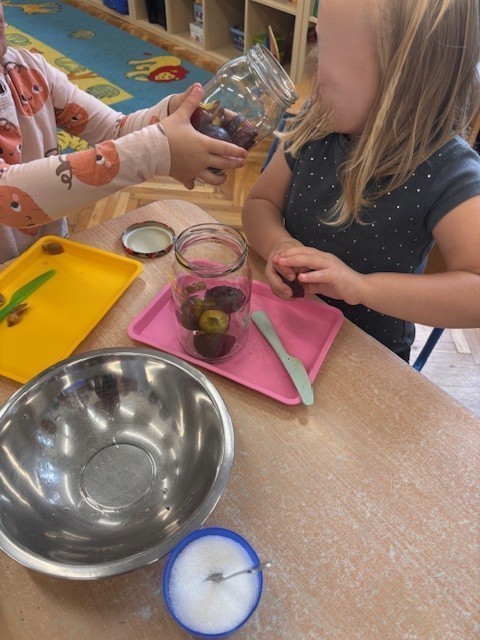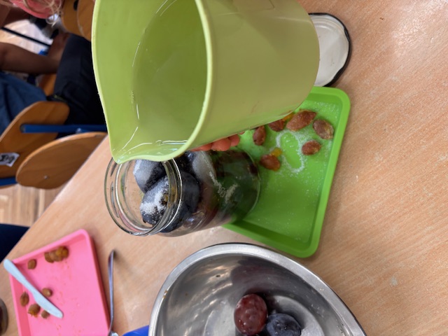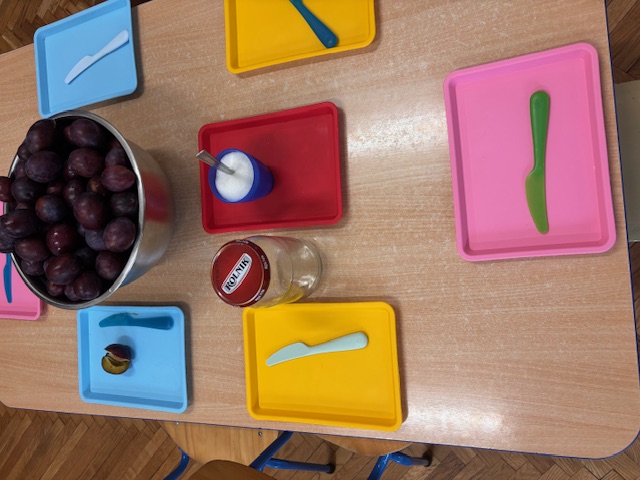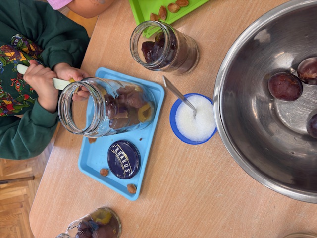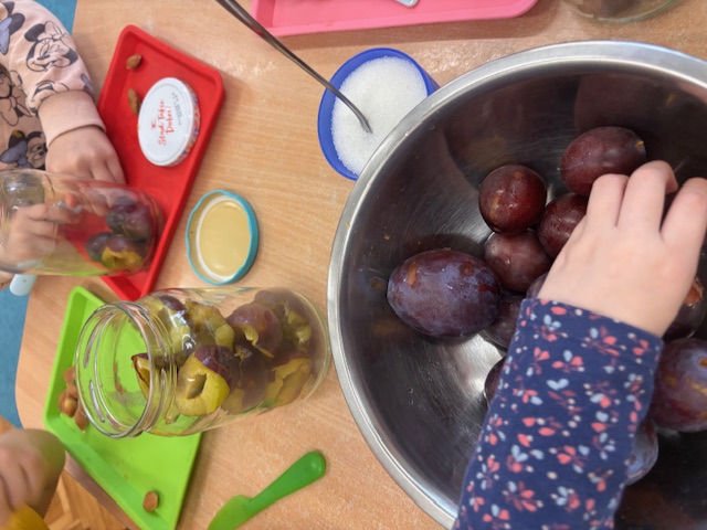 Dzieci z grupy niebieskiej postanowiły wykorzystać dary jesieni i wykonać przetwory. Zajęcia zaczęliśmy od omówienia owoców, tego jak wykonać przetwory i co to w ogóle jest, przygotowania stanowisk pracy, a następnie krojenia śliwek i wyciągania pestek. Część owoców trafiała do słoika a część do małych brzuchów. Dzieci przygotowały pełne słoiki, a następnie z pomocą Pań, zostały zagotowane, dzięki czemu stały się wekami, które mogą stać długo w spiżarniach.