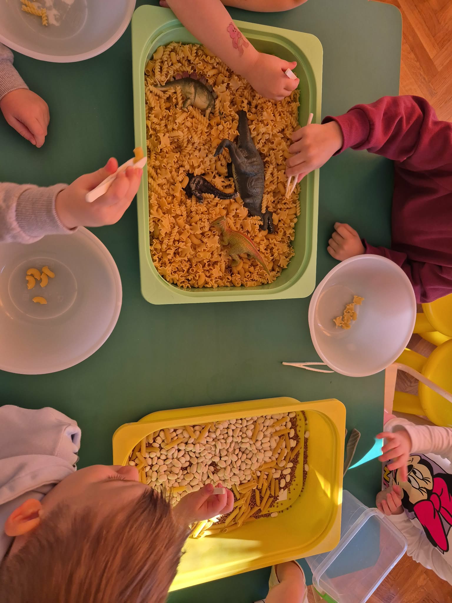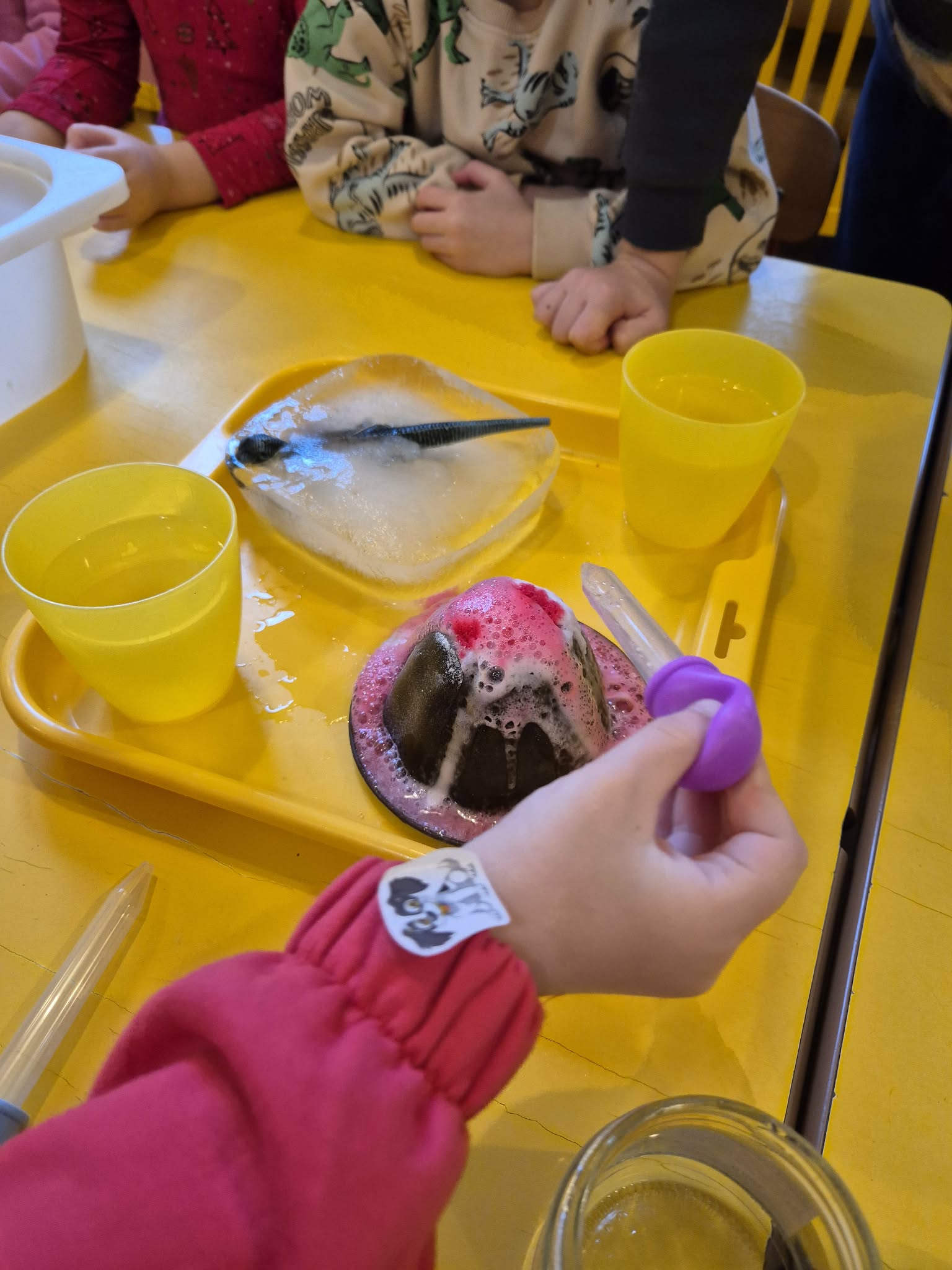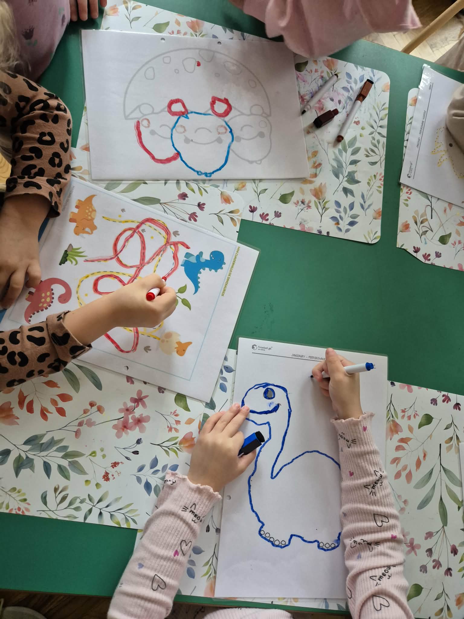 Grupa Zielona wyruszyła w niezwykłą przygodę śladami za dinozaurami. Poznawaliśmy prehistoryczne zwierzęta, w jakich środowiskach żyły i czym się żywiły. W ogrodzie przedszkolnym dzieci szukały tych niezwykłych zwierząt ukrytych w różnych miejscach ogrodu. Dzieci uczestniczyły w zajęciach sensorycznych z pipetkami , dinozaury były w galaretce oraz zamrożone w lodzie , dzieci sprawdzały, który dinozaur szybciej rozmrozi czy w ciepłej czy zimnej wodzie. Dzieci rozwijały precyzję ruchów oraz koordynację wzrokowo ruchową. W naszej grupie nawet wulkan miał erozje. Były też zabawy z wykorzystaniem klocków, darów zabawy Froebla.