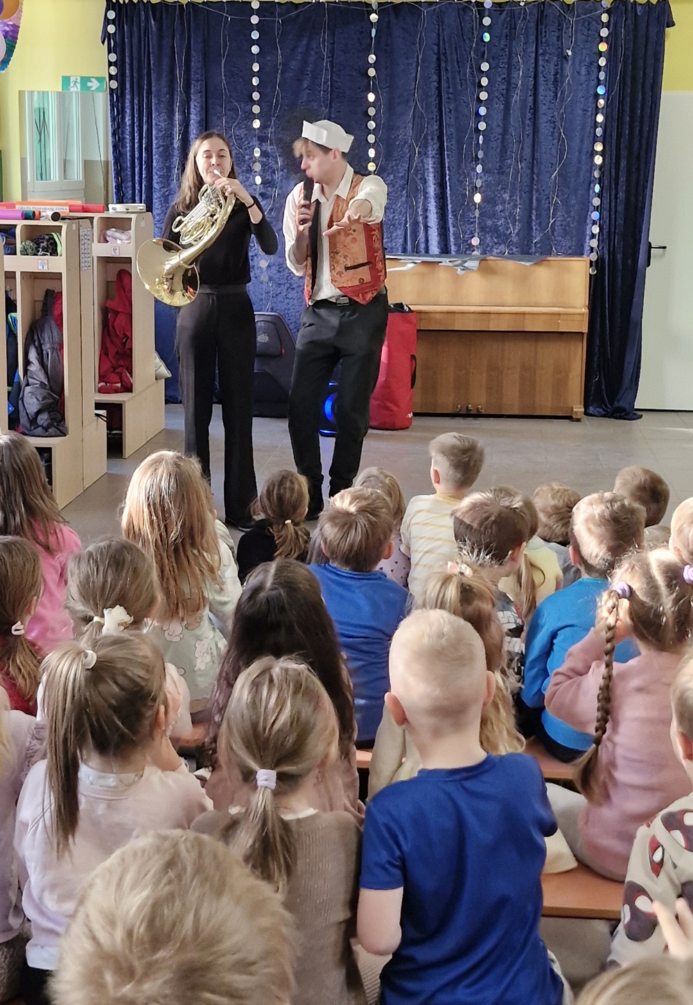 20 stycznia w naszym przedszkolu odbyło się wyjątkowe spotkanie muzyczne z Bachmanem, które dostarczyło dzieciom wielu radosnych i inspirujących wrażeń. Podczas zajęć przedszkolaki miały okazję poznać niezwykły instrument - waltornię oraz dowiedzieć się, jak powstają wydobywane z niej dźwięki.