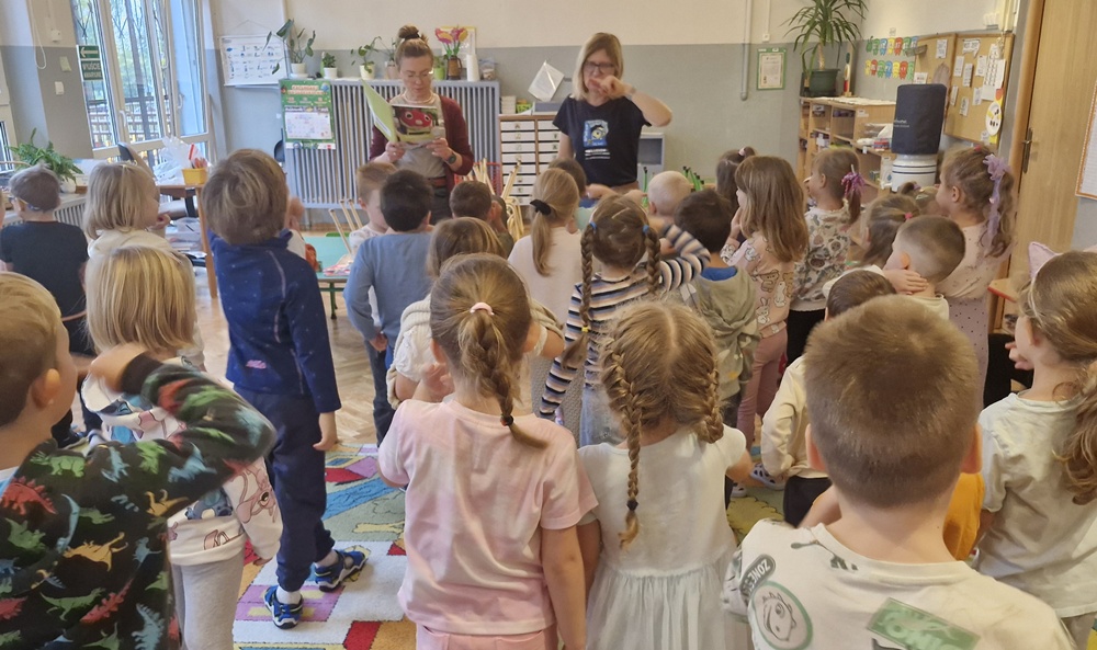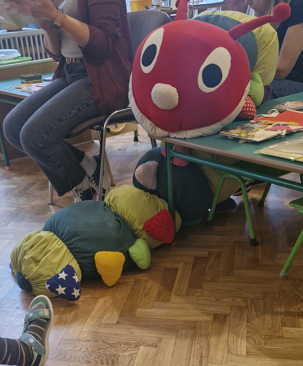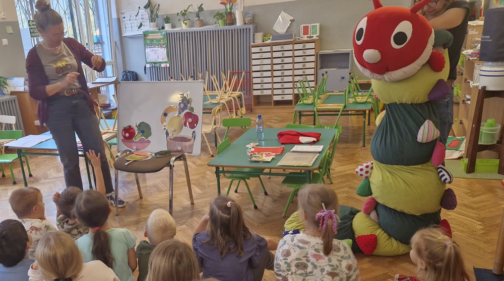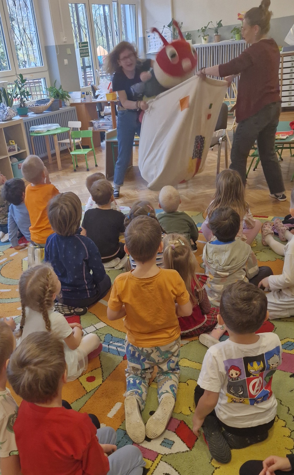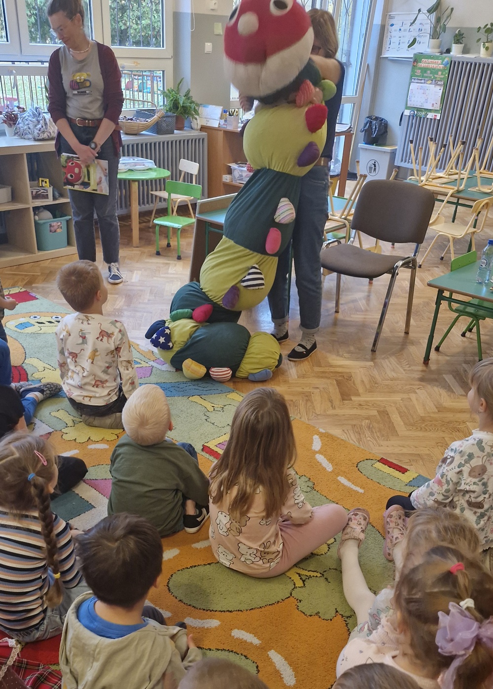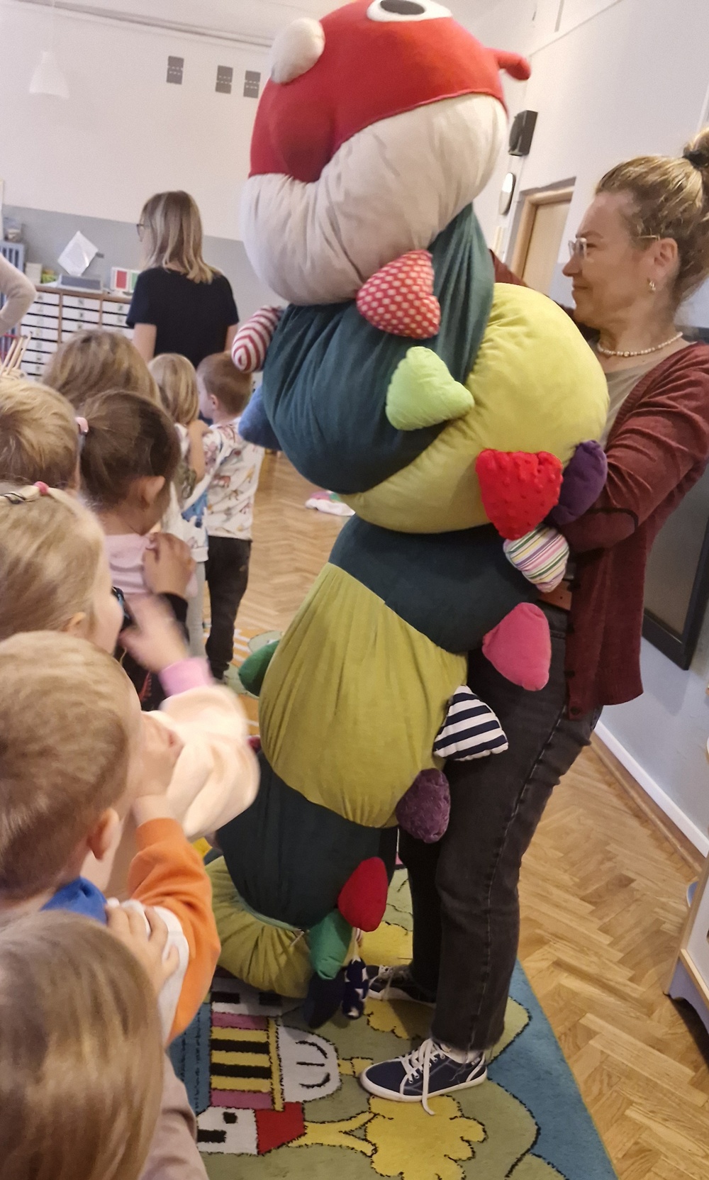 24 października nasze przedszkole odwiedziła autorka książeczek dla dzieci, p. Barbara Szelągowska, która na spotkanie z przedszkolakami zabrała Stonogę Jadzię. W spotkaniu uczestniczyła również ilustratorka książeczek. Dzieci miały okazję wysłuchać fragmentów opowiadań, a razem ze Stonogą Jadzią nazywały i klasyfikowały owoce i warzywa. Na zakończenie zajęć dzieci dostały pamiątkowe kolorowanki. Odwiedziny Stonogi Jadzi wywołały wiele uśmiechu wśród wszystkich przedszkolaków.
