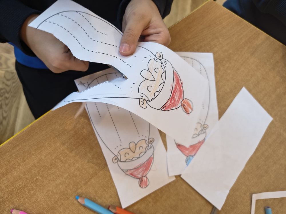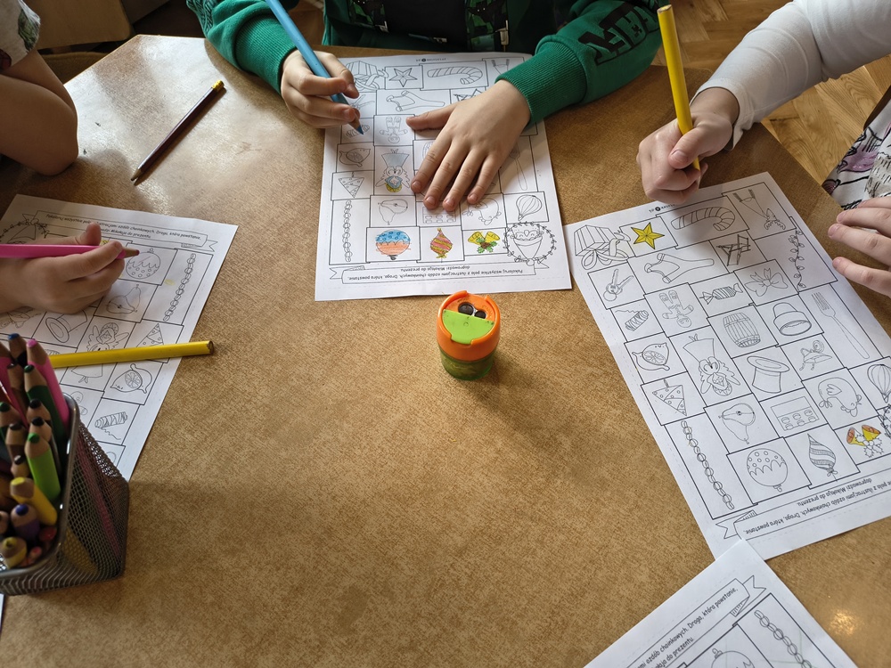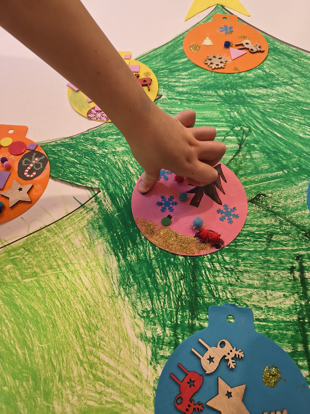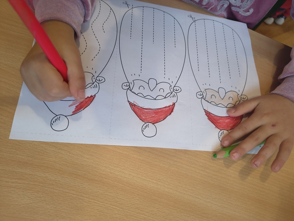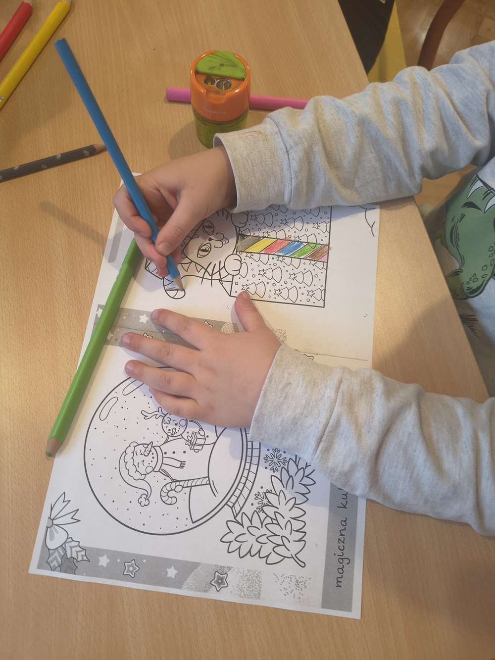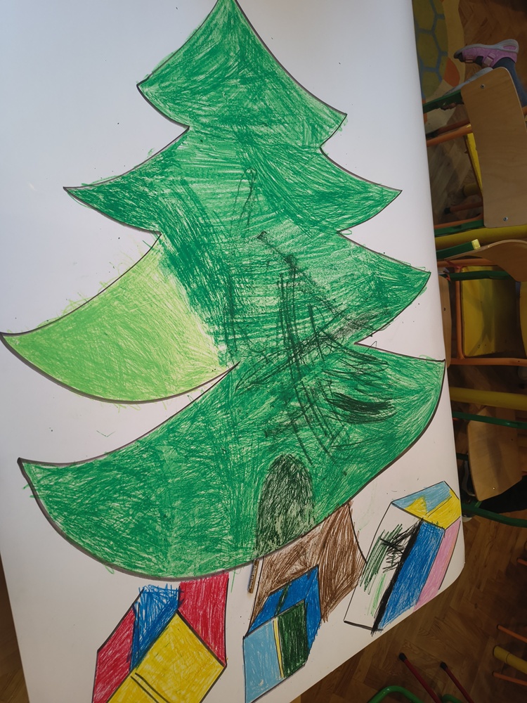 W grudniu przygotowujemy się do magicznych świąt Bożego Narodzenia. Ubieraliśmy choinkę w sali oraz robiliśmy różnego rodzaju dekoracje na kiermasz świąteczny, między innymi stroiki czy książeczki świąteczne. Jedną z prac plastycznych jaką zrobiliśmy była duża choinka. Najpierw ją pokolorowaliśmy zielonymi pastelami, następnie każdy pięknie udekorował bombkę piankową i przykleił ją na naszą choinkę. Robiliśmy również rożnego rodzaju karty pracy oraz kolorowanki o tematyce świątecznej, rozwiązywaliśmy labirynty. Projektowaliśmy także brodę Mikołaja, nadawaliśmy jej wyjątkowy kształt, wycinając nożyczkami.