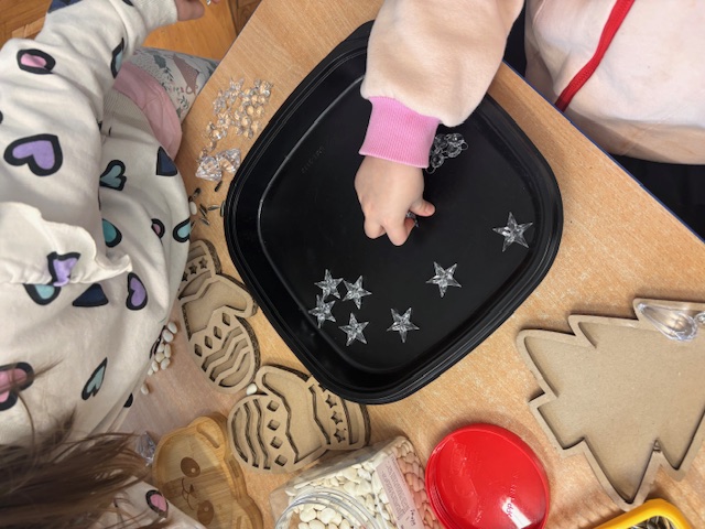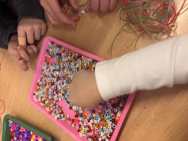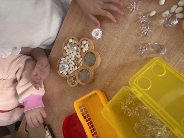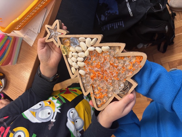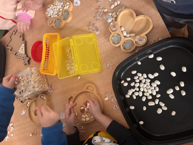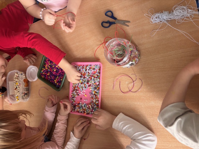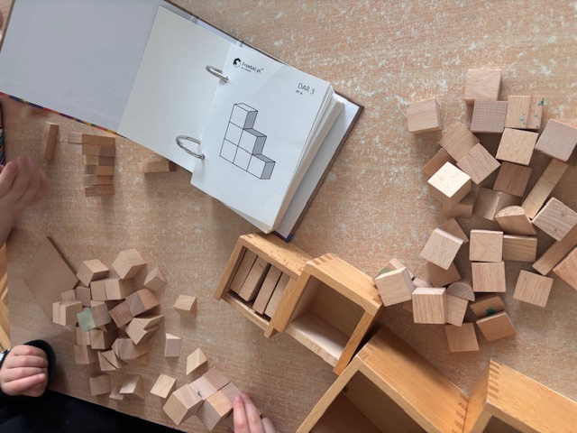 Grupa Niebieska aktywnie uczestniczyła w różnorodnych działaniach rozwijających umiejętności manualne, logiczne oraz sensoryczne. Dzieci doskonaliły sprawność rąk poprzez nawlekanie koralików, ćwicząc przy tym koncentrację i koordynację wzrokowo-ruchową. Dużym zainteresowaniem cieszyło się także układanie klocków według wzorów Froebla, które wspierało rozwój myślenia przestrzennego i kreatywności. Nie zabrakło również aktywności sensorycznych – dzieci chętnie uczestniczyły w wysypywankach z wykorzystaniem naturalnych materiałów, poznając różne faktury i rozwijając zmysł dotyku.