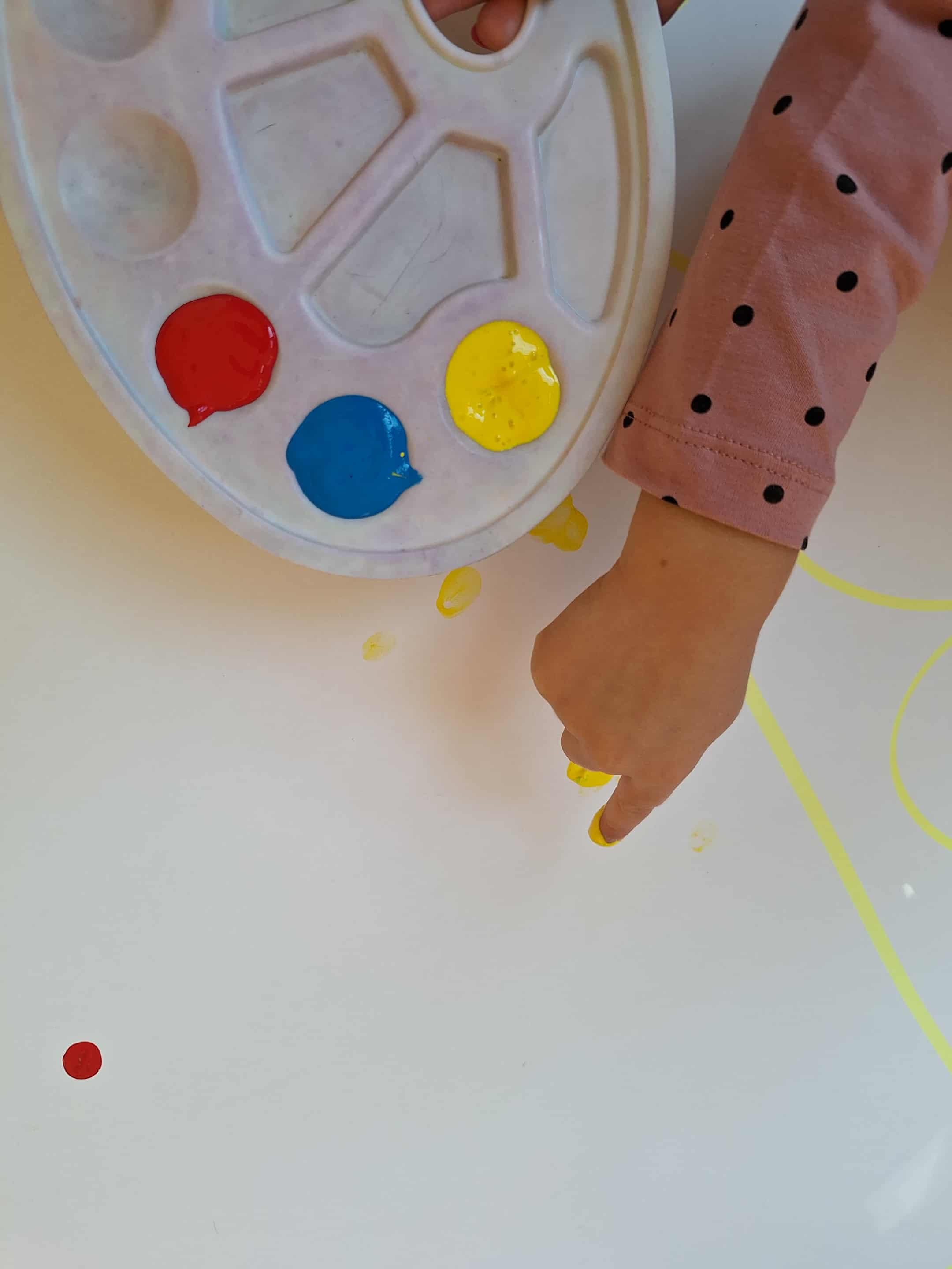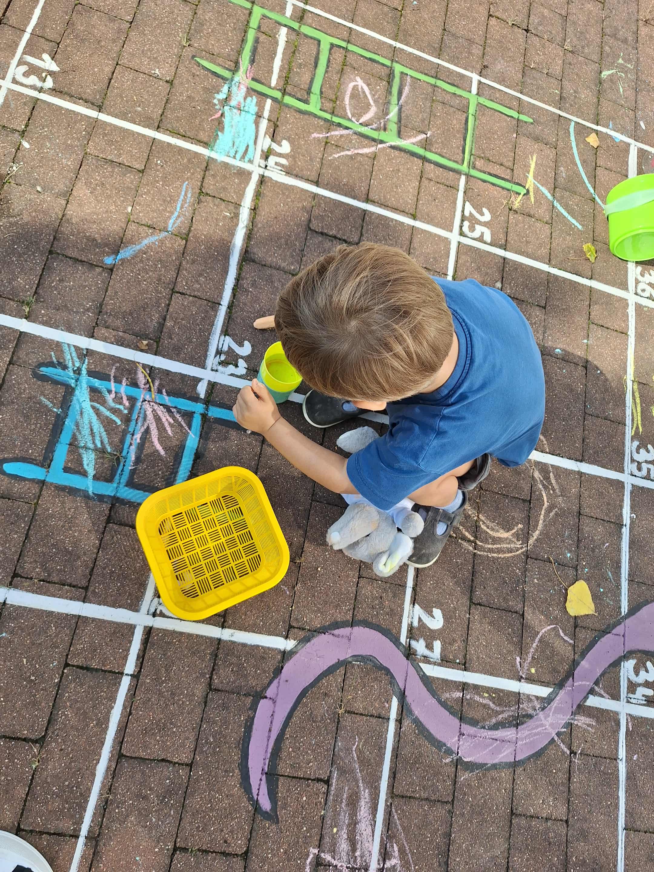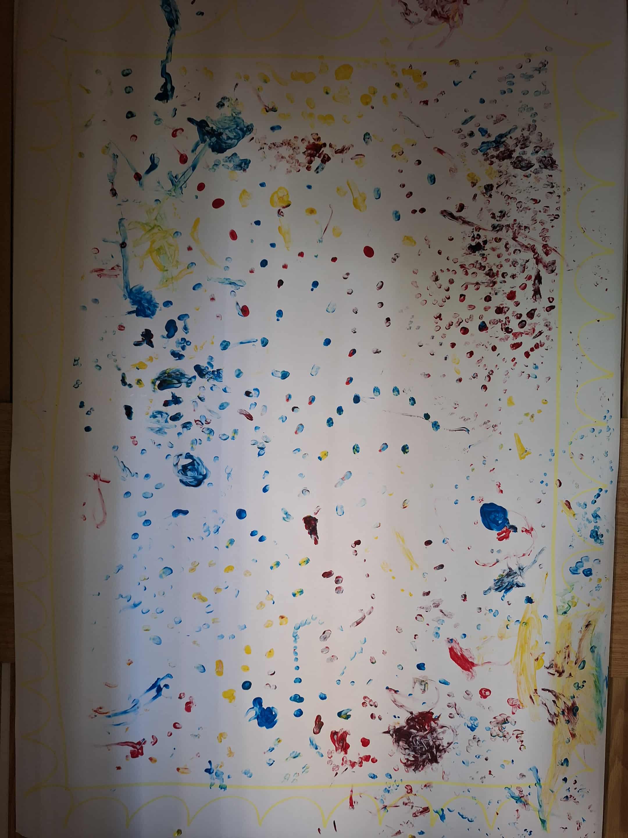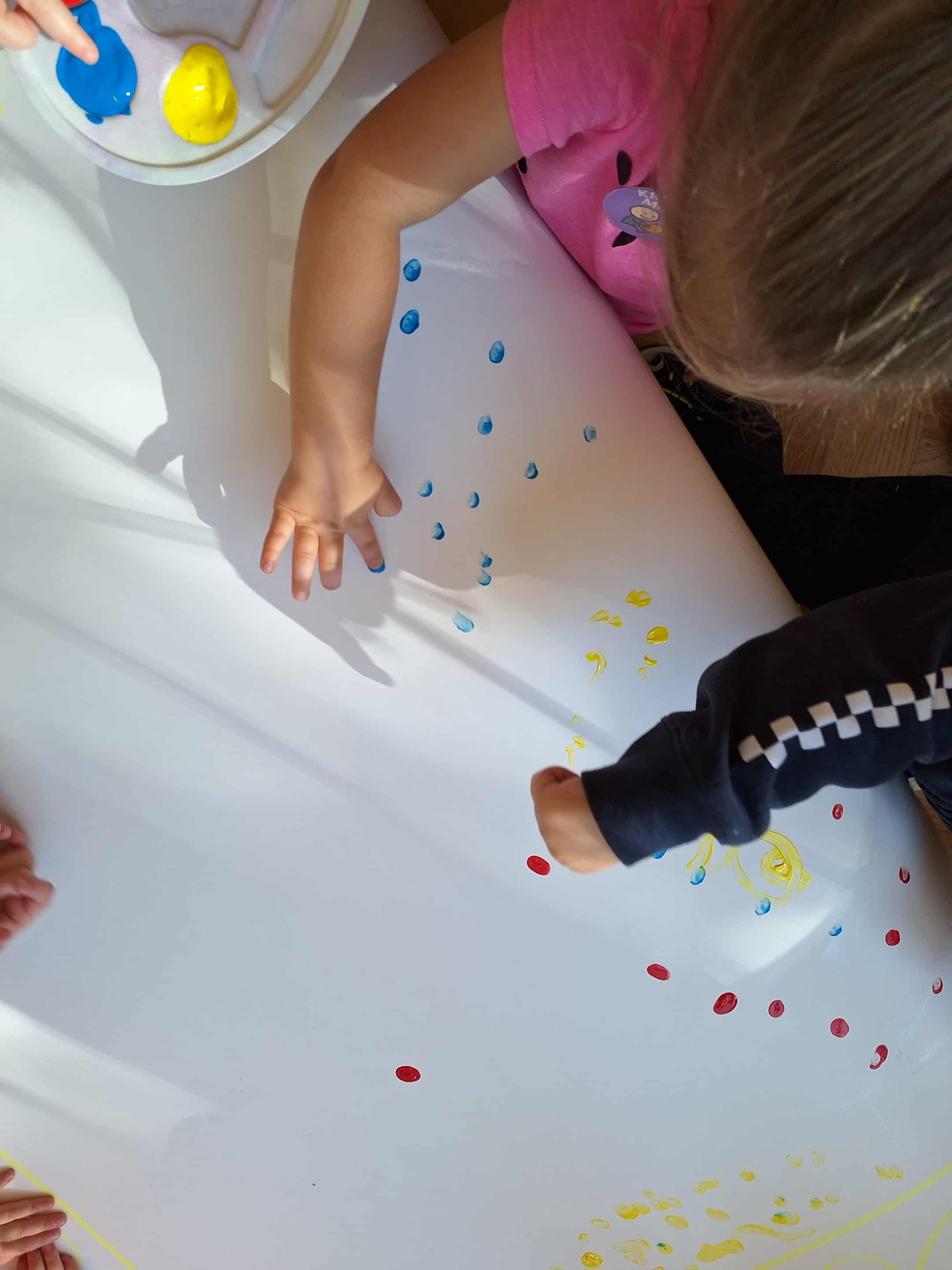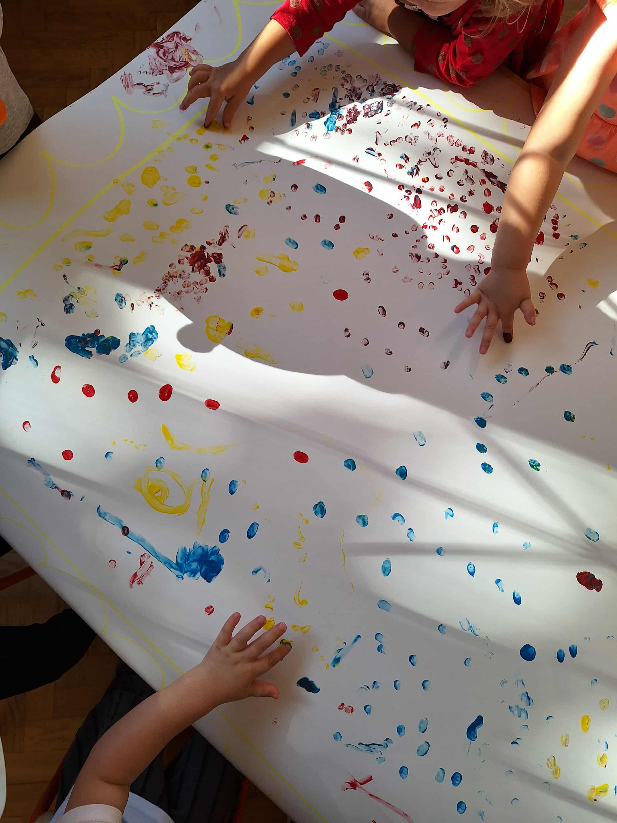 15 września w przedszkolu obchodziliśmy Dzień kropki. Z tej okazji w grupie żółtej odbyło się wiele wspólnych zabaw. Wspólnie wykonaliśmy pracę plastyczną, dzieci malowały farbami kropki na dużym kartonie za pomocą paluszków. Bawiliśmy się także w poszukiwaczy kropek w sali, dzieci bawiły się świetnie, a każda znaleziona kropka była dla nich motywacją do dalszego poszukiwania. Korzystaliśmy również z ostatnich promieni słonecznych w ogrodzie przedszkolnym. Przedszkolaki rysowały kredą na tarasie oraz zbierały liście.